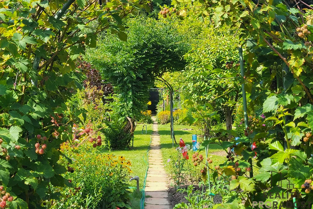 Pozemek je pečlivě udržovaný a pyšní se vzrostlými ovocnými stromy – jabloní, broskví, švestkou, kdouloňí či netradičním kiwi. Nechybí ani bobuloviny: maliny, ostružiny, borůvky, černý a červený rybíz, rakytník, černý jeřáb či dřín.