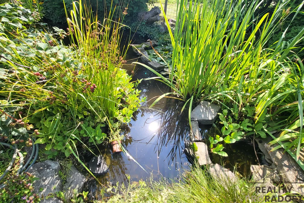 Zahrada je rozdělena na užitkovou a okrasnou část – jedna plná chutí a druhá barev. V okrasné části vás potěší spousta rozkvetlých květin, které zahradě dodávají jedinečnou atmosféru a mění ji během roku v barevný ráj. Najdete zde také posezení se slunečníkem, houpačku, ohniště i romantické vodní jezírko – ideální pro chvíle odpočinku.