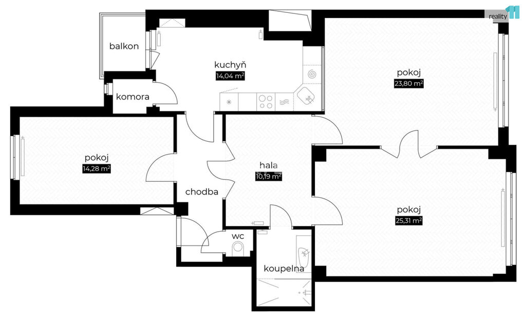 koupelnou se sprchovým koutem, samostatným WC o celkové ploše 105 m². Kuchyně
