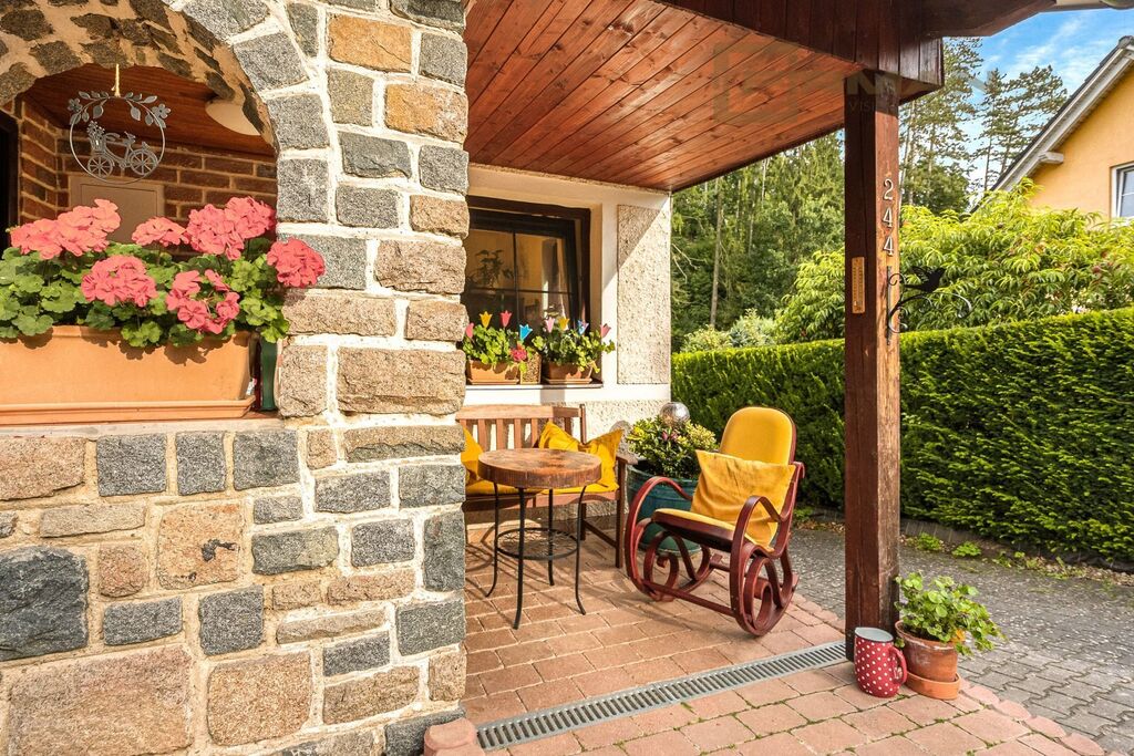 Zahrada je místem, kde budete chtít trávit čas – pečlivě upravená, s venkovním krbem a záhony plnými květin, obklopená vzrostlými stromy na stráni za domem, které fungují doslova jako kyslíkové lázně. Stromy vám budou každý den tiše sloužit a vlastní studna vám výbornou zajistí čistou vodu. Pokud dáte přednost vodovodnímu řadu, přípojka je už připravena na pozemku.“