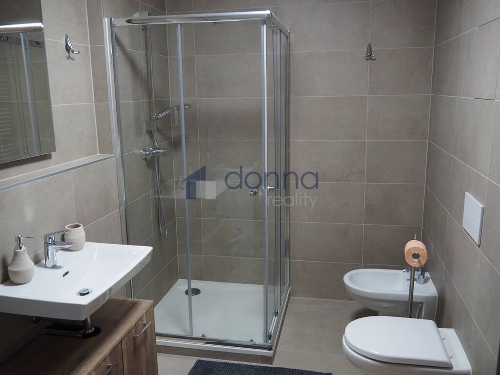 Dále ložnice s manželskou postelí, zařízená koupelna se sprchovým koutem, toaletou, bidetem a lodžie.