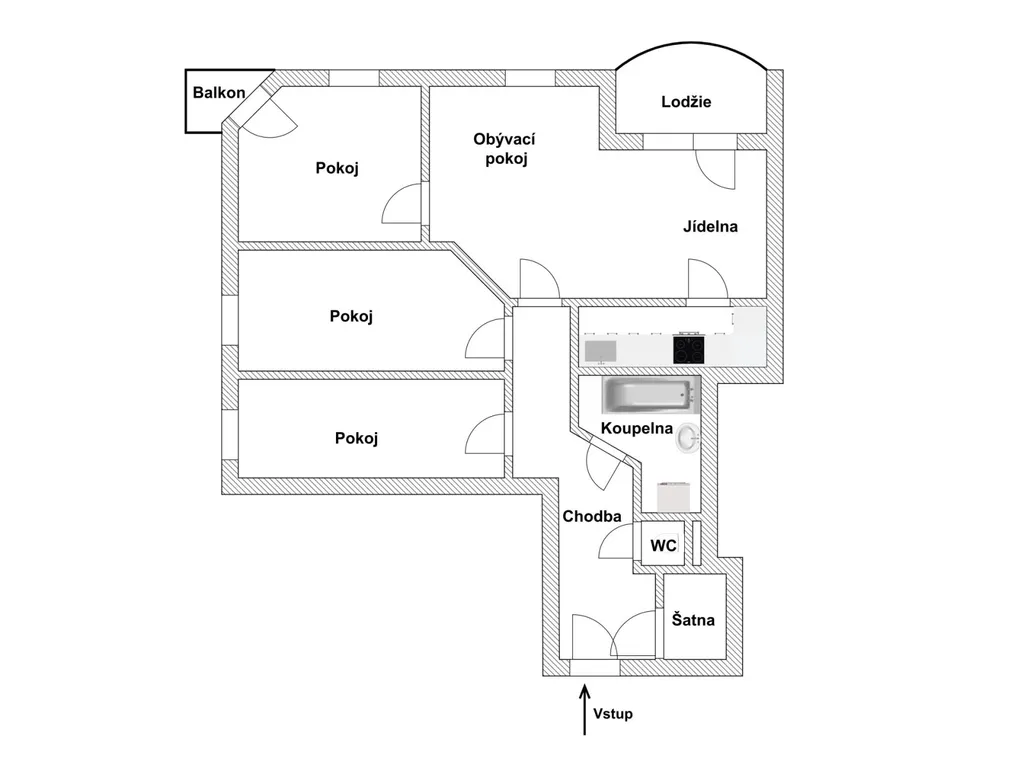 Byt je moderně dispozičně řešený a poskytuje dostatek místa pro pohodlný rodinný život. Najdete zde vzdušnou vstupní chodbu, velkou kuchyni, obývací pokoj s jídelnou, který se stane srdcem domova. Dále tři samostatné pokoje, koupelnu, samostatné WC, a praktickou šatnu.