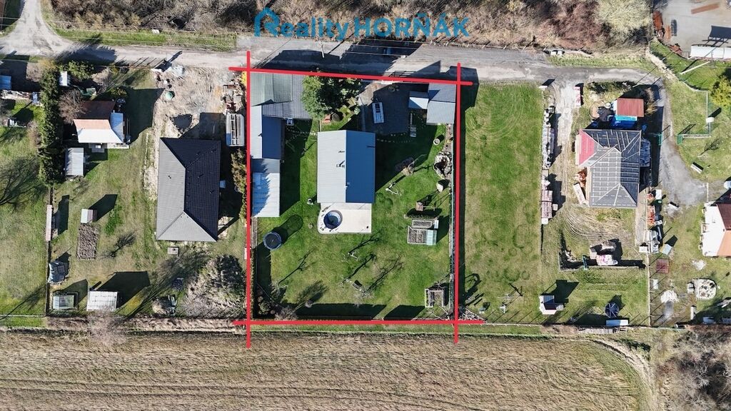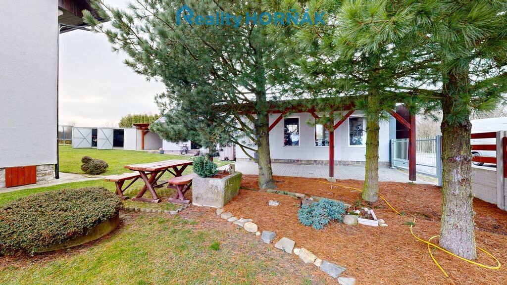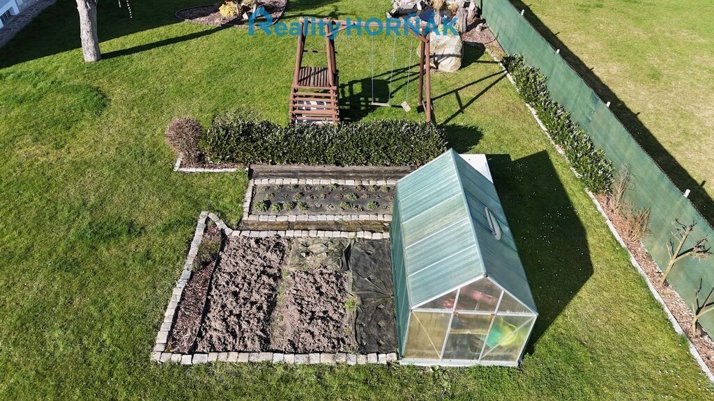 Nabízený rodinný dům je vystavěn na vlastní stavební parcele o výměře 106 m2, obklopené vlastní okrasnou zahradou 1813 m2 se skleníkem, pěstebními záhony a malým jezírkem. Do zpevněné, vydlážděné plochy za domem je zapuštěn kruhový bazén s pískovou filtrací. Při okraji zahrady je vyměřena další stavební parcela (111 m2), která je zastavěna celozděnou autodílnou (s velkými vjezdovými vraty, montážní jámou a půdou pro skladování sezónních věcí), navazujícími garážemi a garážovými stáními. Vlevo od nové vjezdové brány s brankou najdeme šikovný roubený sklad zahradního nářadí s přístřeškem na palivové dříví a káru za auto.