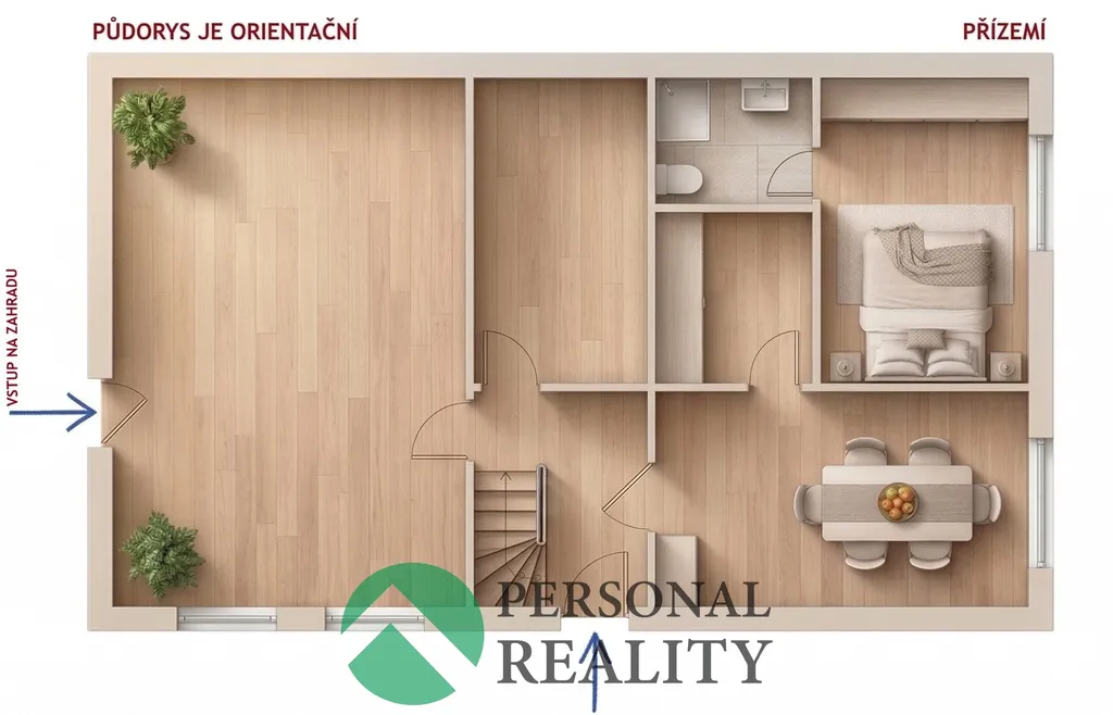 V přízemí se nachází byt o dispozici 1+1 s vlastní koupelnou. Součástí této části domu je také samostatná místnost se vstupem na zahradu, která se nabízí například k vybudování letní kuchyně či odpočinkového zázemí. Dům je částečně podsklepen (cca 16 m²).