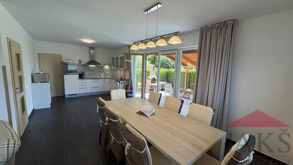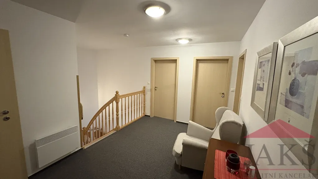 Popis: technická část: garáž (regály) a technická místnost (pračka); 1.NP (81,54 m2): předsíň (věšáky s botníkem), koupelna s finskou saunou (sprch. kout, umyv. se zrcadlem), sam. WC s umyv., ložnice, hala se schodištěm, komora (2x el. boiler), prostorný obývací pokoj 49 m2 s kuchyňským koutem (rohová kuch. linka s vestav. spotřebiči: HV a MV trouba, sklo-ker. deska, lednice, digestoř a myčka), jídelnou, krbovými kamny a vstupem na zastřešenou terasu s posezením a venkovním krbem; 2.NP (80,12 m2): podesta, koupelna (vana, sprch. kout, umyv. se zrcadlem, WC, topný žebřík), ložnice, 2x ložnice s balkonem s dechberoucím výhledem, uzamykatelná hlavní ložnice s vlastní koupelnou (vana, sprch. kout, umyv. se zrcadlem, WC, topný žebřík) s balkonem, šatnou a předsíní (vest. skříň). Movité vybavení vč. nábytku je v ceně.