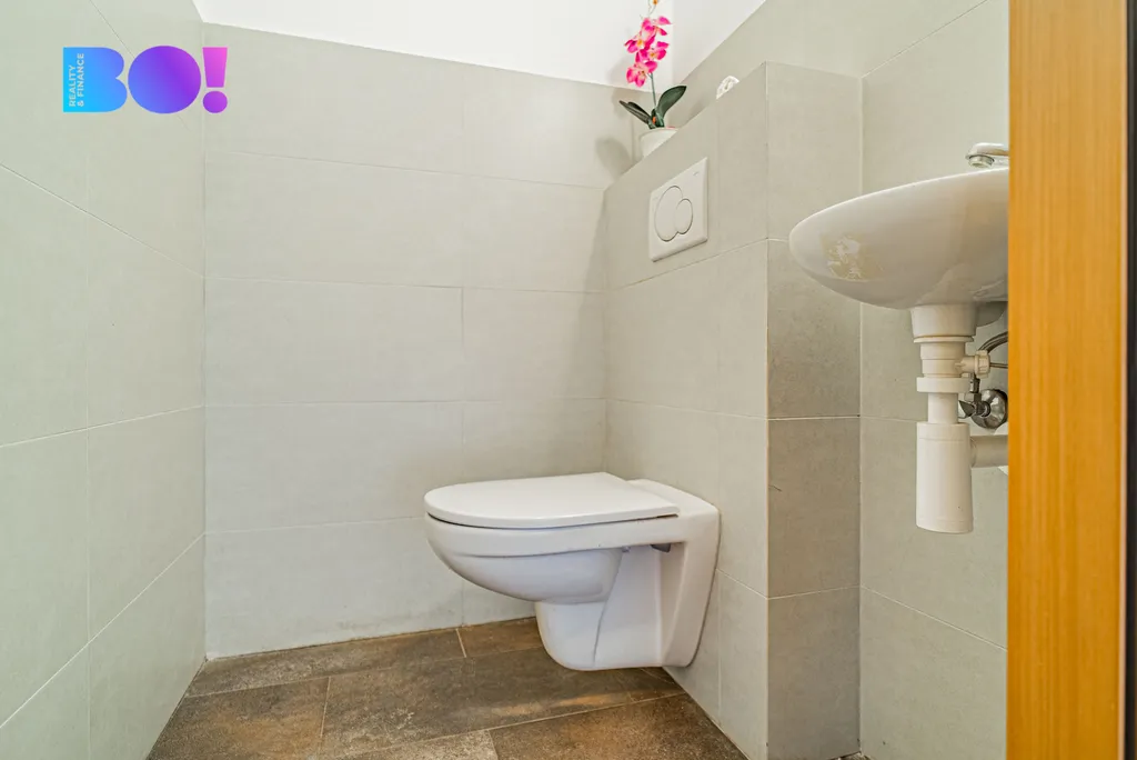 Kuchyň propojená s obývacím pokojem nabízí 55 m² nadčasového prostoru s velkým množstvím denního světla – vysoké stropy a velká okna vytváří vzdušný dojem, který nebývá v řadových domech obvyklý. V celém domě naleznete kvalitní dřevěné masivní podlahy, dveře a zárubně i dřevěná střešní okna Velux a nadčasový design. V domě jsou dvě koupelny a každé patro má min. 1 WC, což je komfortní i pro větší rodinu nebo zástupce více generací. Všechna okna jsou opatřena žaluziemi.