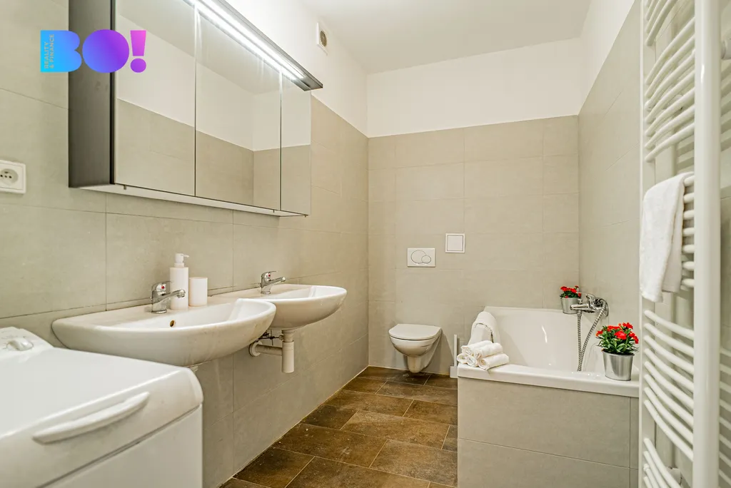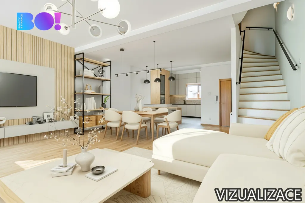Kuchyň propojená s obývacím pokojem nabízí 55 m² nadčasového prostoru s velkým množstvím denního světla – vysoké stropy a velká okna vytváří vzdušný dojem, který nebývá v řadových domech obvyklý. V celém domě naleznete kvalitní dřevěné masivní podlahy, dveře a zárubně i dřevěná střešní okna Velux a nadčasový design. V domě jsou dvě koupelny a každé patro má min. 1 WC, což je komfortní i pro větší rodinu nebo zástupce více generací. Všechna okna jsou opatřena žaluziemi.
