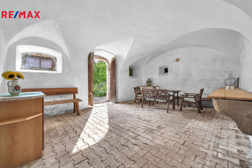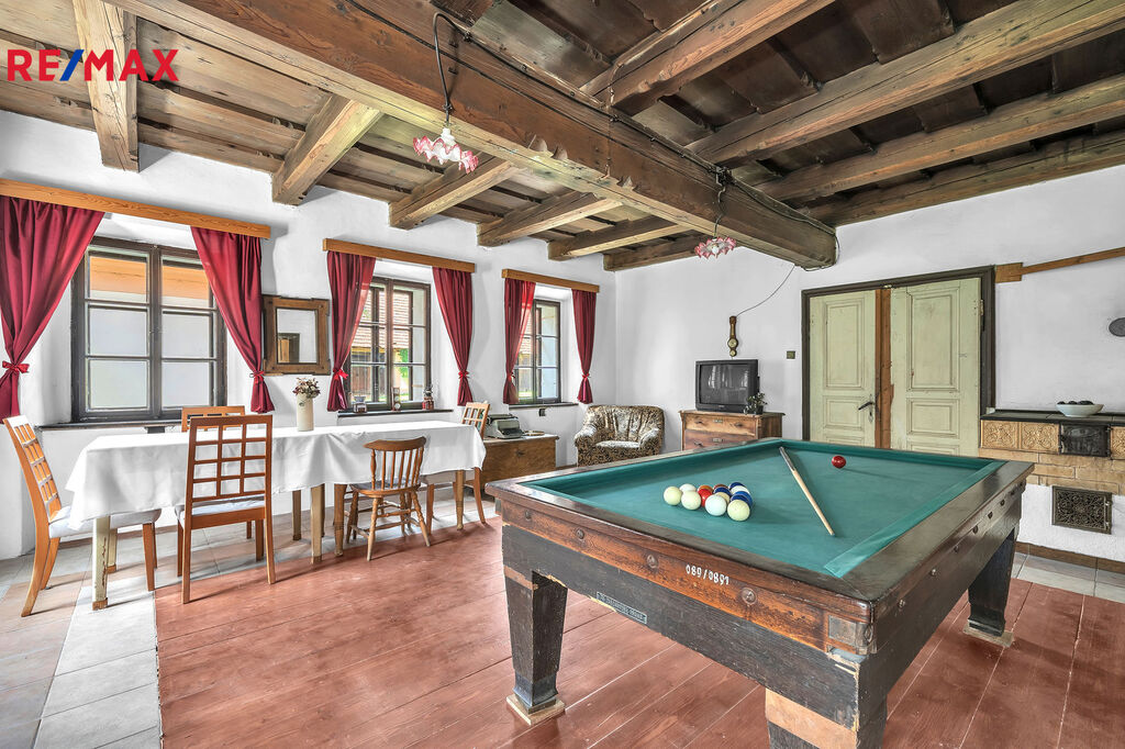 Současná dispozice obytné budovy je v 1. podlaží rozdělena na prosvětlený obývací pokoj s kachlovými kamny, kuchyň, 2 samostatné pokoje, zrekonstruovanou koupelnu a navazující hospodářskou část s konírnou, dílnou a dalším volným prostorem pro možné rozšíření obytné plochy. V druhém podlaží, do kterého se dostanete po původním dřevěném schodišti, se nachází 3. samostatný pokoj a rozsáhlé půdní prostory vhodné k realizaci vestavby. Třetí podlaží, respektive podkroví, je poté opět tvořeno velkým otevřeným půdním prostorem. Za zmínku rozhodně stojí rovněž stylový sklep s klenutým stropem. Dispoziční uspořádání jednotlivých místností je znázorněno na přiloženém půdorysu.