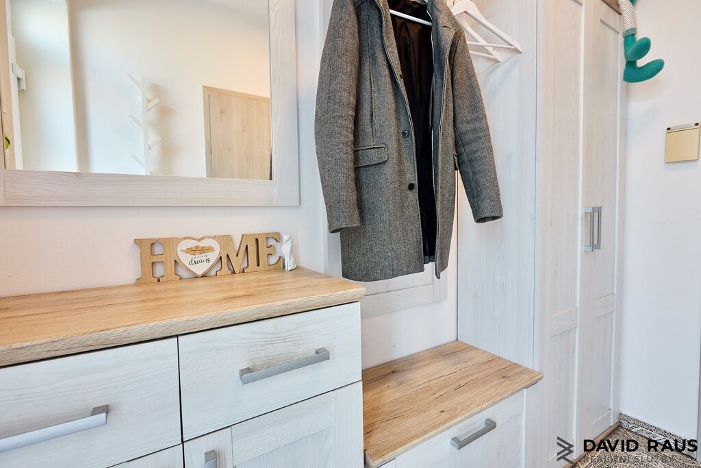Povrchy podlah tvoří vinylové podlahy v dekoru dřeva v kombinaci s keramickou dlažbou. Vytápění nemovitosti zajišťuje elektrické podlahového vytápění. Vysokých nákladů za elektřinu se bát nemusíte. Díky fotovoltaické elektrárně je nabízená nemovitost částečně energeticky soběstačná.