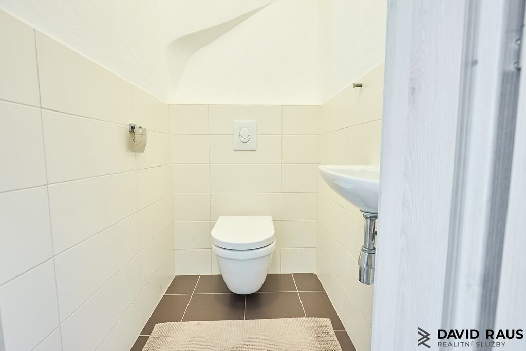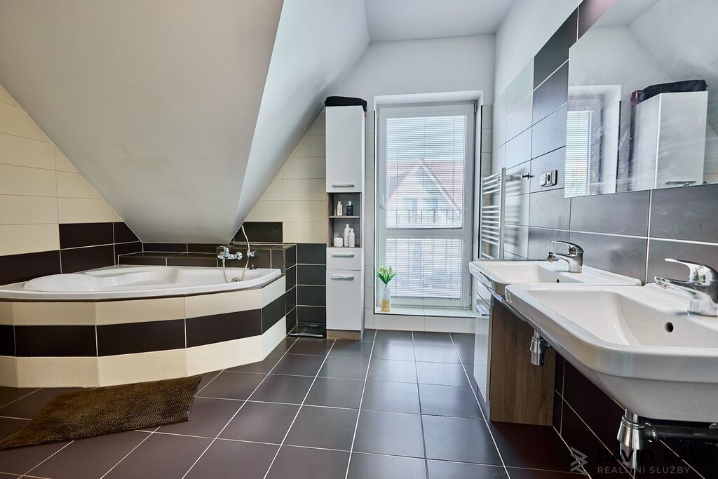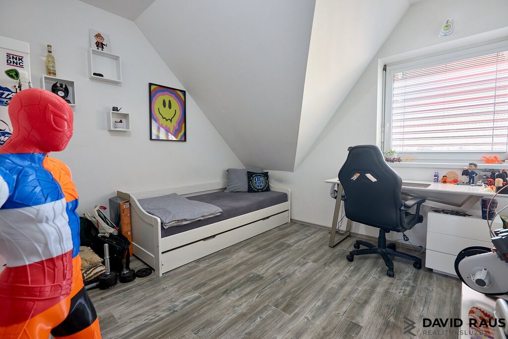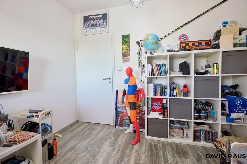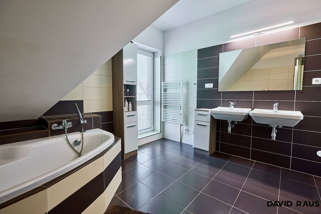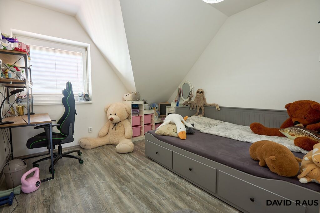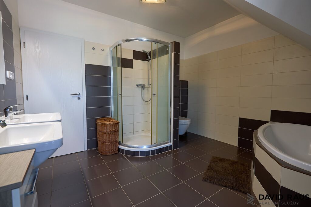 Vstupními dveřmi vcházíme do předsíně s dostatkem místa na úložné prostory a odkládání věcí (4,37 m²). Míjíme vstup, po pravé straně od vstupních dveří, do technické místnosti ( 8,75 m²) a vstup na samostatné WC pod schodištěm. Za mě efektivní řešení, jak využít prázdný prostor pod schodištěm. Následně vcházíme do vzdušného, prostorného obývacího pokoje s jídelnou a kuchyňským koutem (44,41 m²). Nadčasovým prvek obývacího pokoje jsou francouzská okna, která dodávají místnosti dostatek denního světla a zároveň umožňují přístup na vlastní zahradu. V létě si tak můžete ranní kávu vychutnat na čerstvém vzduchu na terase s výhledem do zeleně. Pokud jste snili o vlastním wellnes, zde se Vám Váš se splní. Relaxovat můžete jak ve vířivce na terase nebo v zastřešeném bazéně. Vracíme se zpět do předsíně a po schodišti vystoupáme do patra, kde postupně navštívíme zbývající tři obytné místnosti ( ložnici 11,56 m², dětský pokoj 11,56 m² , dětský pokoj 11,48 m²), samostatnou šatnu ( 5,18 m² ) a koupelnu s rohovou vanou, sprchovým koutem a WC (11,48 m²).