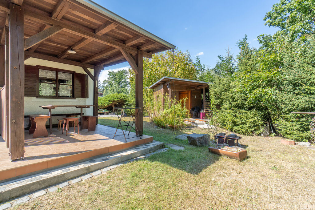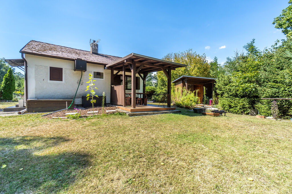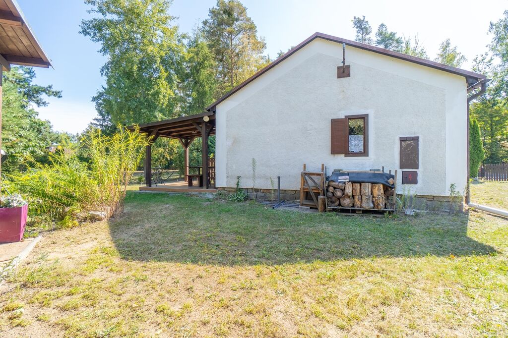 Samotná nemovitost se skládá ze vstupního prostoru, obývací pokoje, kuchyně, ložnice a WC. K příjemnému posezení vám poslouží pergola napojená přímo na chatu.