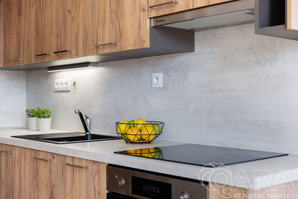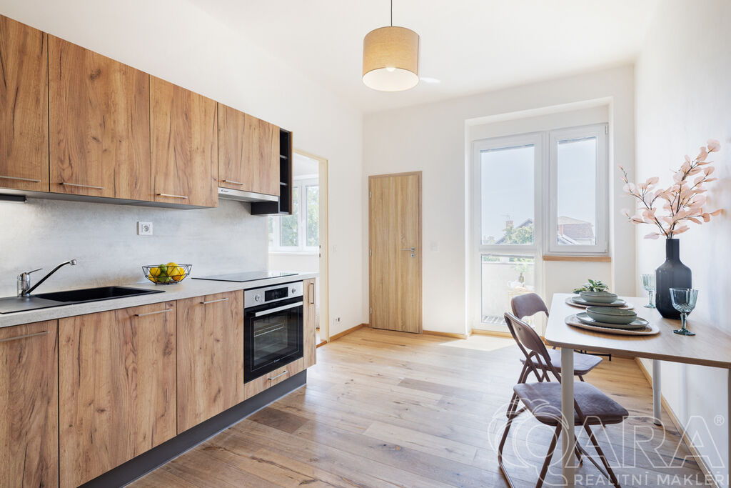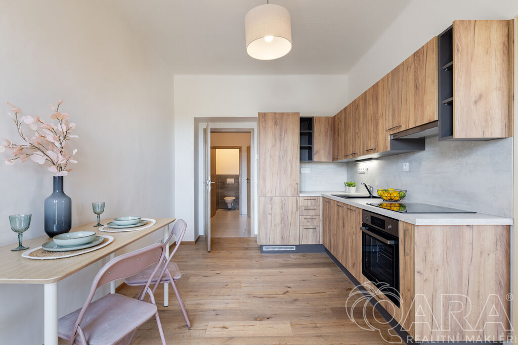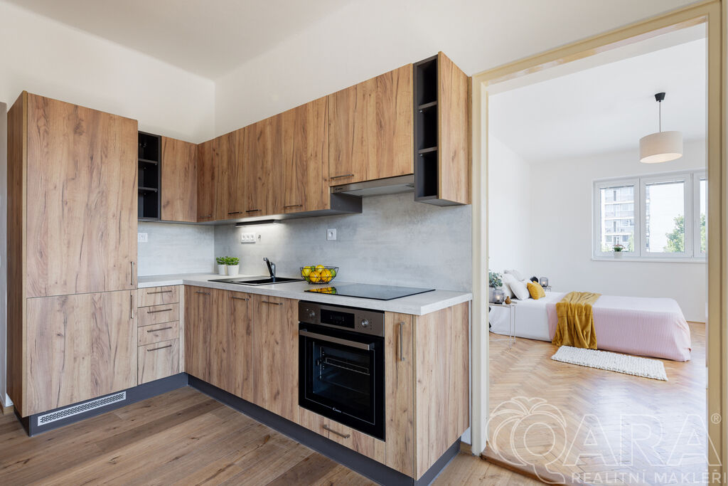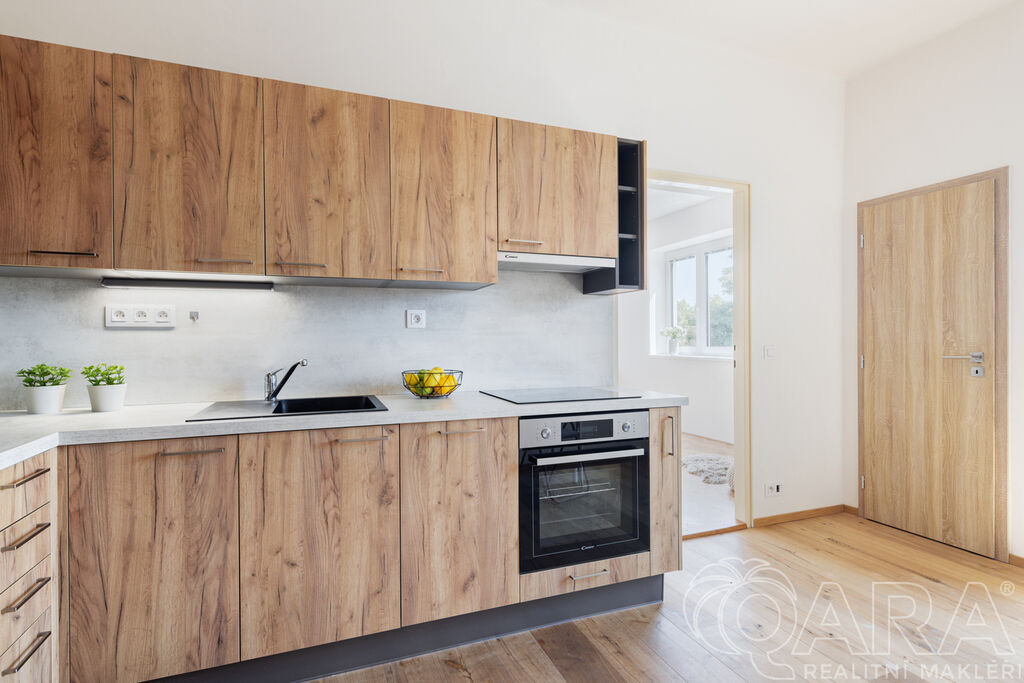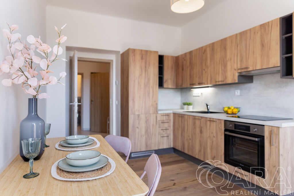 Byt je dispozičně řešen velmi prakticky. Ze vstupní chodby se dostanete na samostatnou toaletu, do koupelny se sprchovým koutem a následně do kuchyně, ze které je vstup do ložnice. Kuchyňská část je vybavena moderní linkou se všemi spotřebiči a nechybí ani praktická komora.