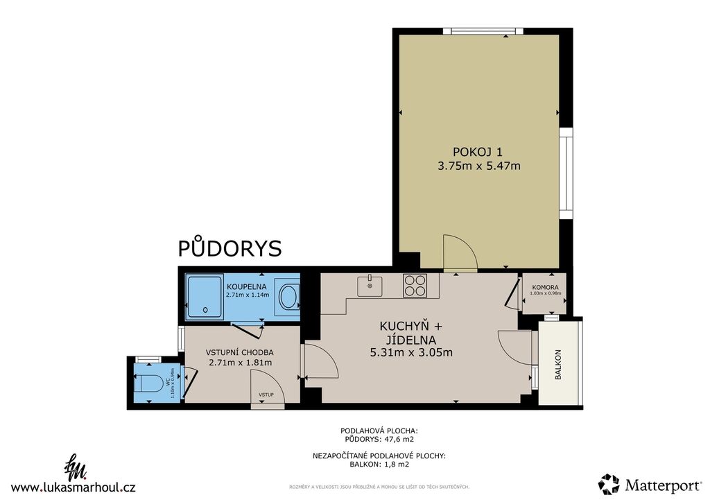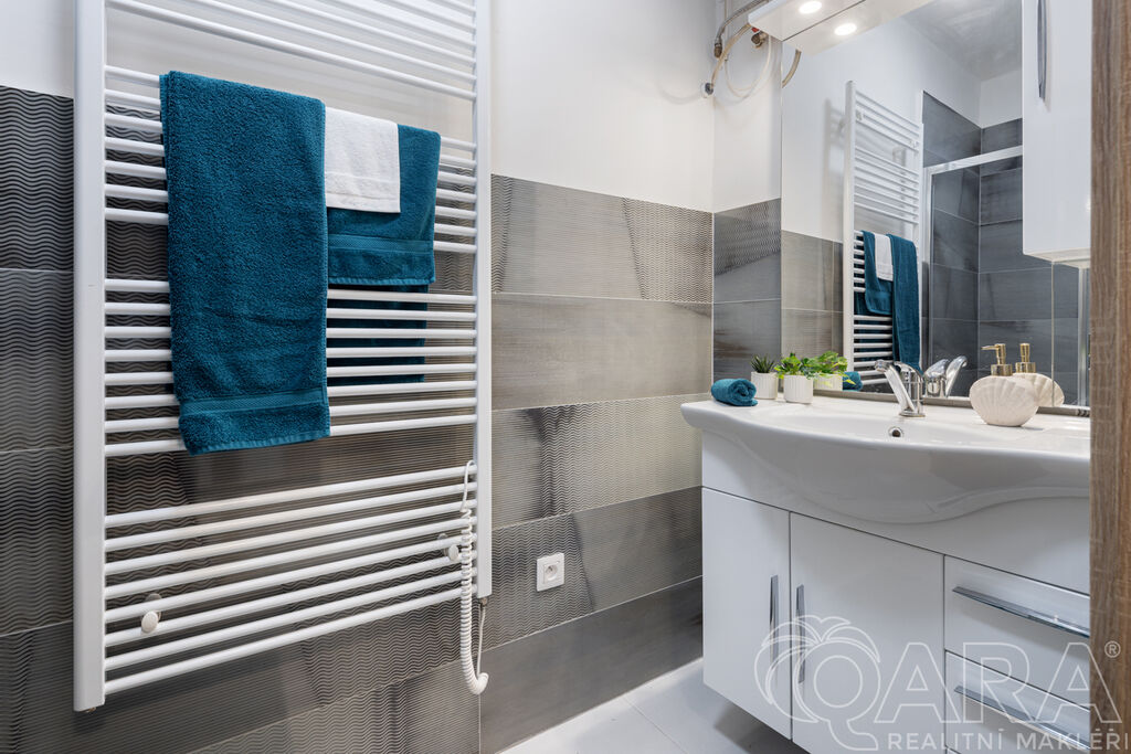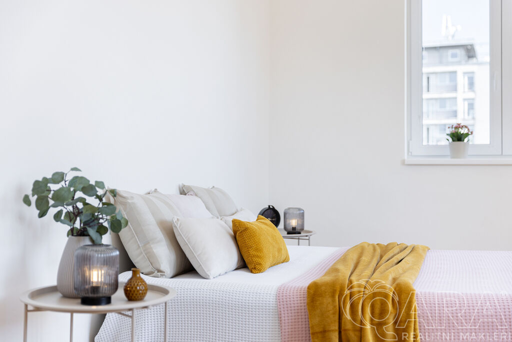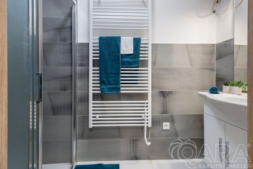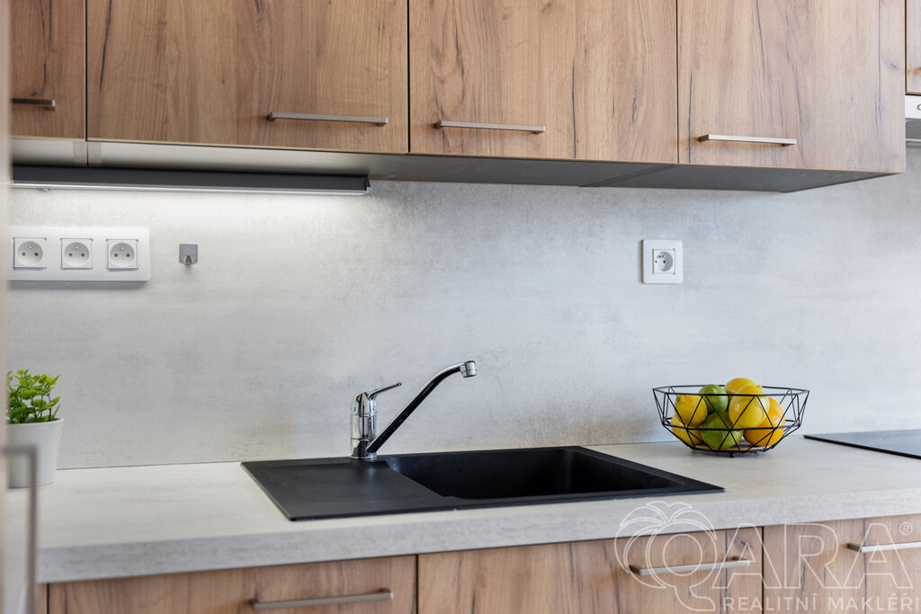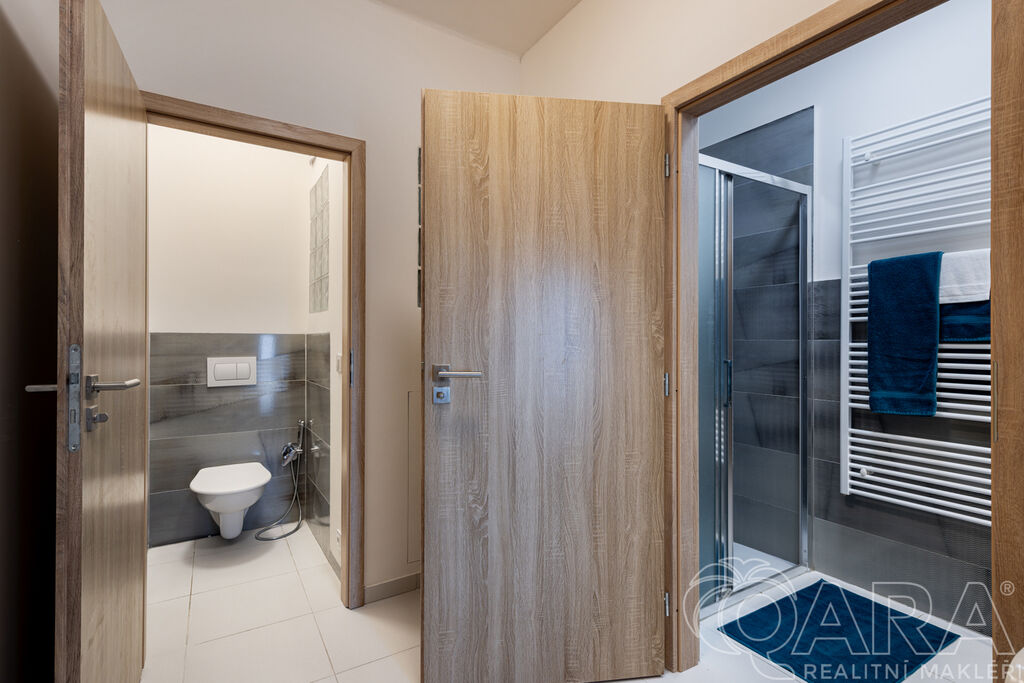 Byt je dispozičně řešen velmi prakticky. Ze vstupní chodby se dostanete na samostatnou toaletu, do koupelny se sprchovým koutem a následně do kuchyně, ze které je vstup do ložnice. Kuchyňská část je vybavena moderní linkou se všemi spotřebiči a nechybí ani praktická komora.