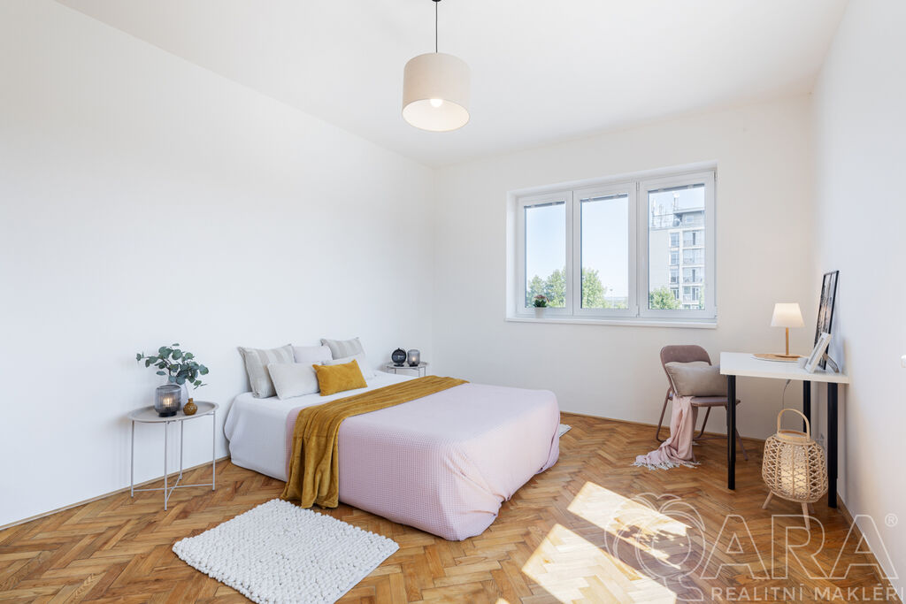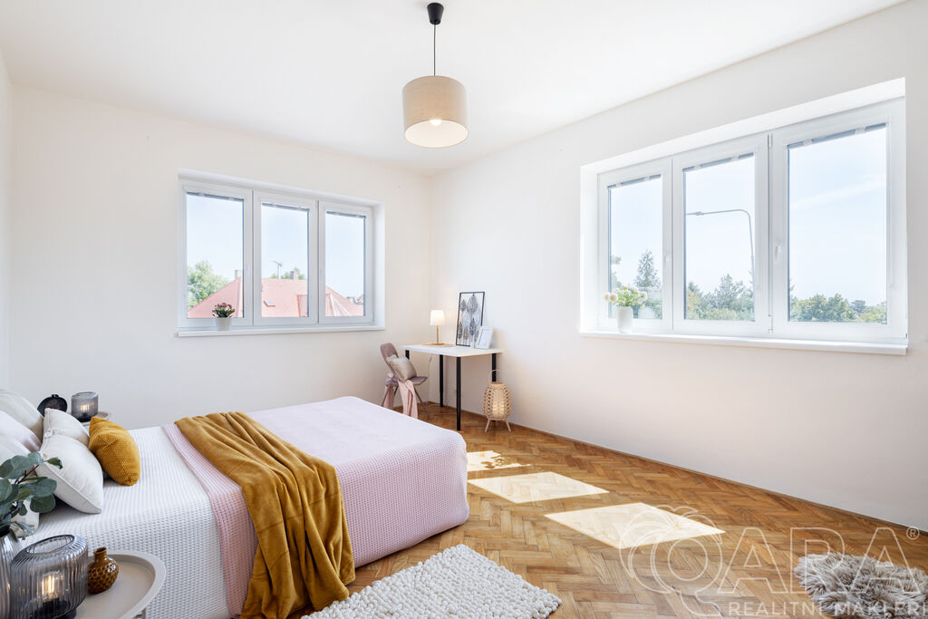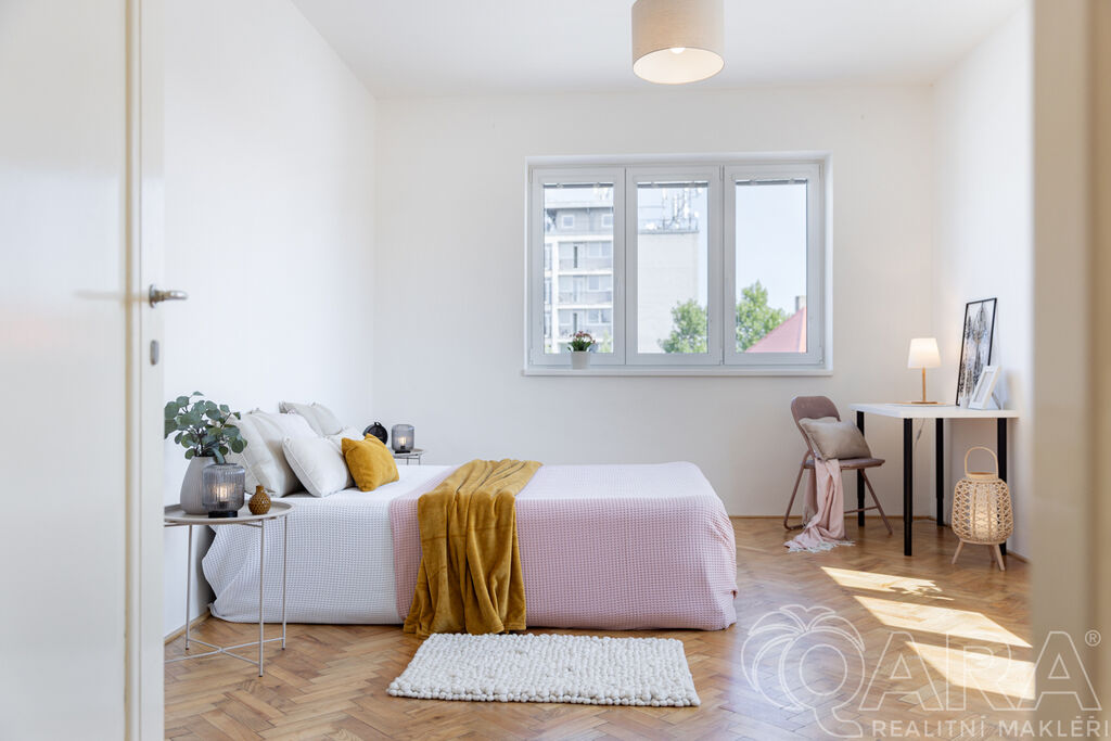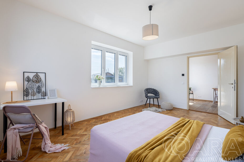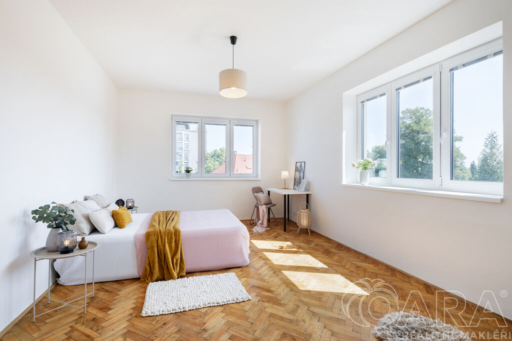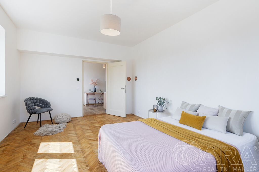 Hlavní pokoj o velikosti 20 m² vás zaujme původními parketami, které byly renovovány a dodávají místnosti útulný a příjemný dojem. Dalším bonusem celého bytu jsou velká okna s orientací na východ, která zajišťují dostatek světla po celý den.