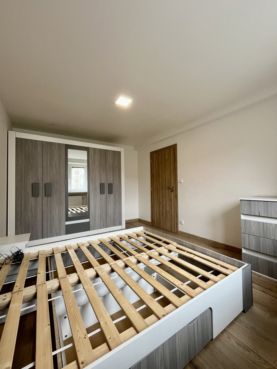 Obývací pokoj a ložnice s praktickým nábytkem (postelový rám, šatní skříň)