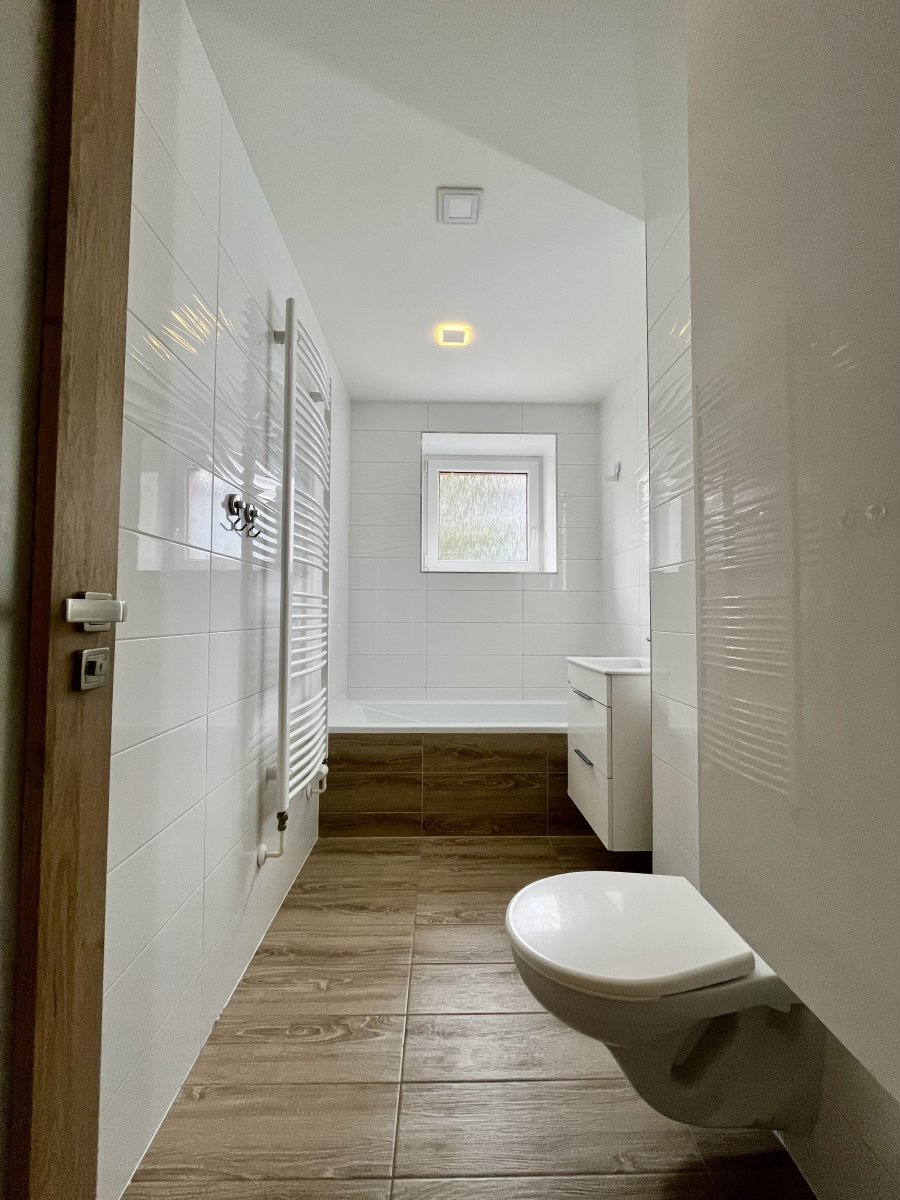 Koupelna se sprchovým koutem, umyvadlem a toaletou