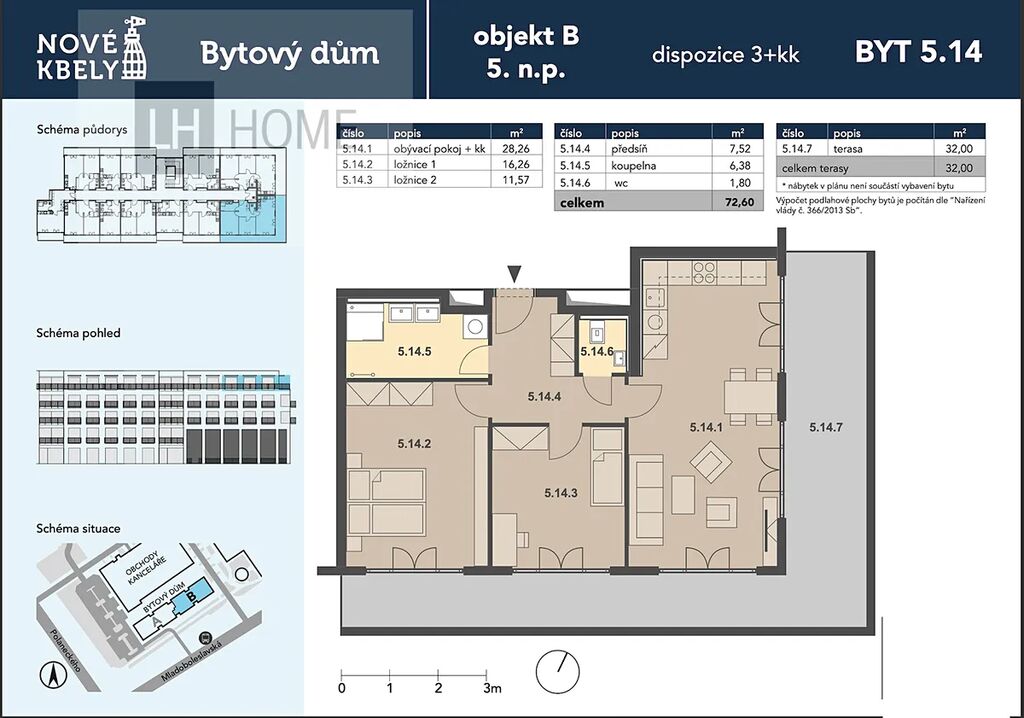 Byt 3+kk 72,60m2 (podlahové plochy) + terasou 32m2 situovaný na jihovýchodní stranu. Byt se bude nacházet ve 5. podlaží. Součástí kupní ceny bytu jsou vinylové podlahy, interiérové dveře s obložkami, obklady a dlažby v koupelně a na wc, prostorný sprchový kout, skříňka s umyvadlem, zrcadlem a poličkou, wc, topný žebřík, videotelefon.