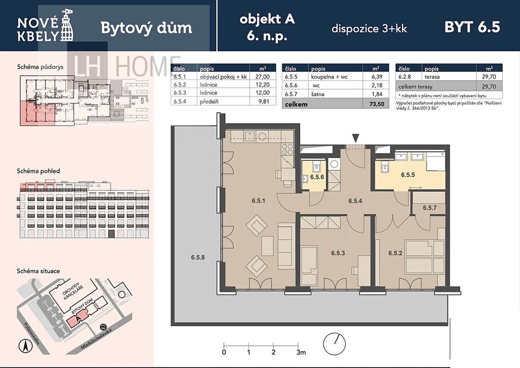 Byt 3+kk 73,50m2 (podlahové plochy) + terasou 29,70m2 . Byt se bude nacházet ve 6. podlaží. Součástí kupní ceny bytu jsou vinylové podlahy, interiérové dveře s obložkami, obklady a dlažby v koupelně a na wc, prostorný sprchový kout, skříňka s umyvadlem, zrcadlem a poličkou, wc, topný žebřík, videotelefon.