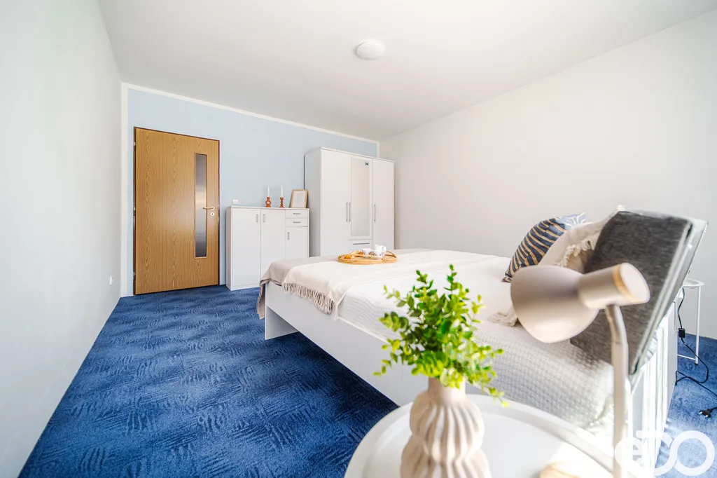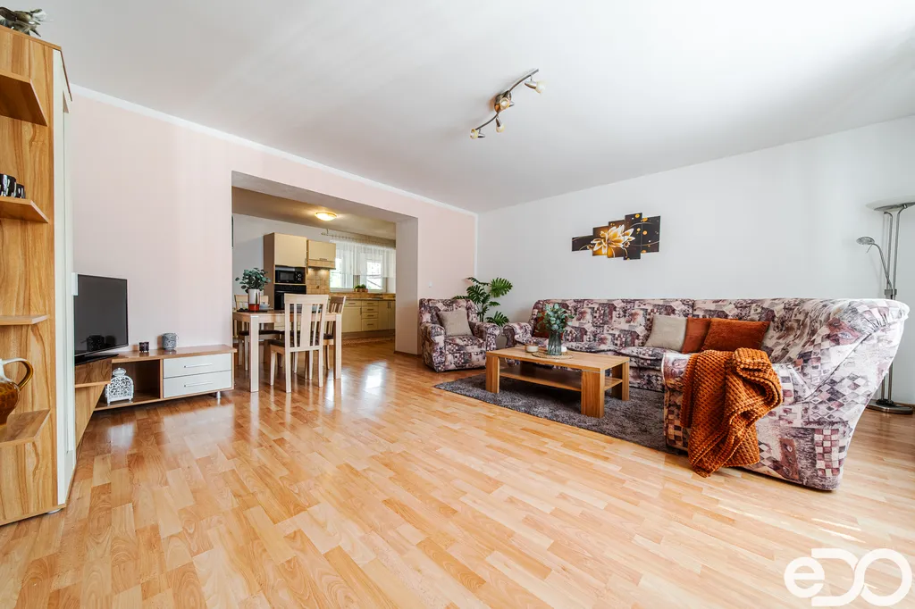 Hlavní obytná část: kuchyně, obývací pokoj, ložnice, dva pokoje, koupelna a WC.