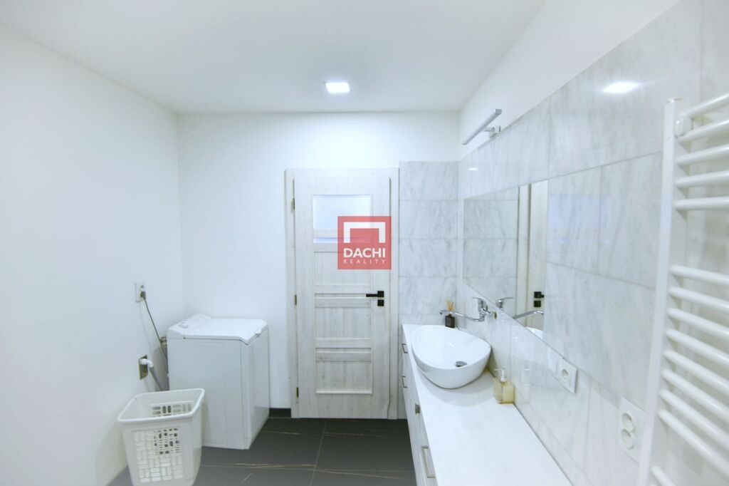 V dolním patře bytu najdeme prostornou předsíň 6 m se šatní skříní, velkorysou obývací zónu 21m s kuchyňským koutem a jídelním stolem. Budoucí majitel bude mít k dispozici luxusní koupelnu 7,3 m obloženou mramorem s prostorným sprchovým koutem, umyvadlem a WC. V horním patře bytu se nachází velmi prostorná ložnice 23 m s nádherným výhledem na olomoucké historické skvosty a dominanty města.