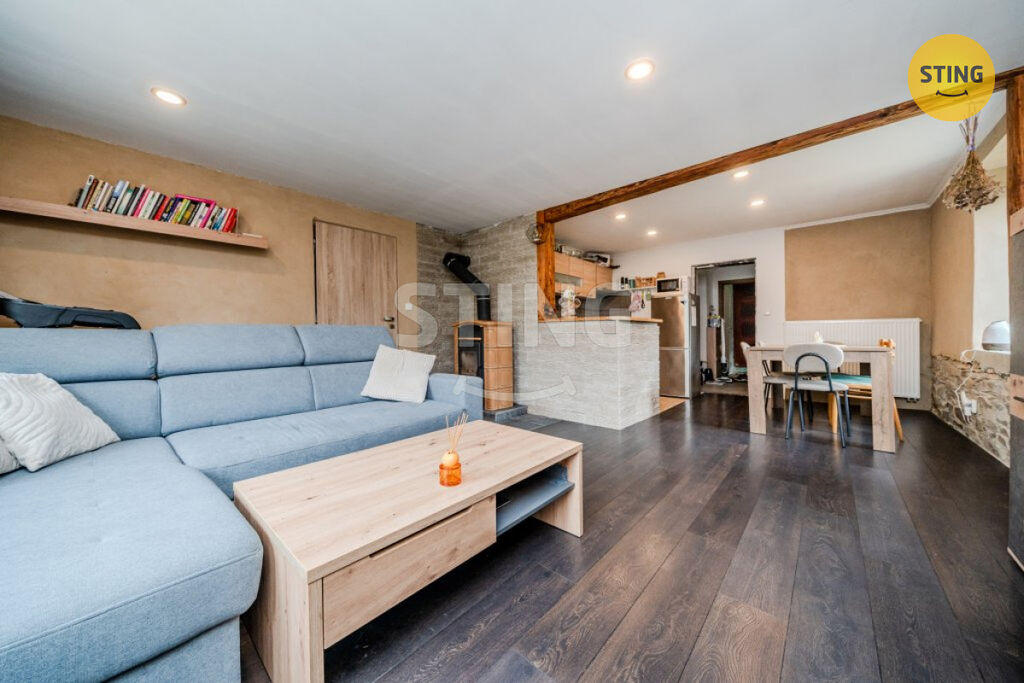 V přízemí je bytová jednotka o dispozici 3+kk a podlahové ploše 90 m2, po rekonstrukci, která proběhla v r. 2022, nabízí kuchyni s kuchyňskou linkou se spotřebiči : indukční deska s troubou, myčka, lednice. Obývací prostor s krbovými kachlovými kamny, pracovna, ložnice s šatnou, koupelna s umyvadlem a umyvadlovou skříni, vana, samostatná toaleta. Podlahy beton a PVC. Z chodby vstup do sklepa, kotelny a druhého patra.