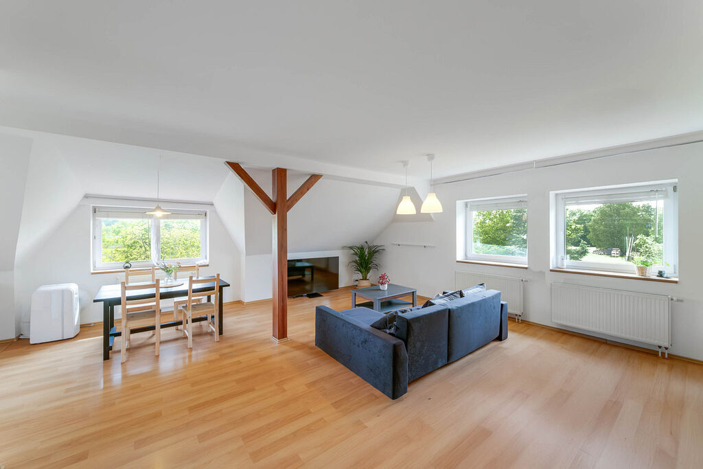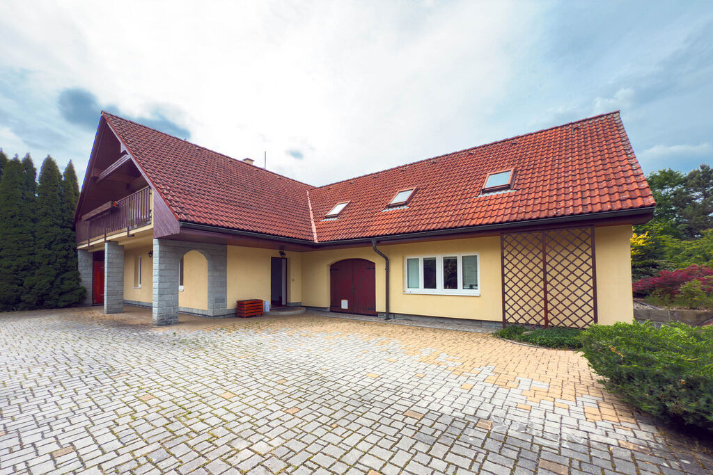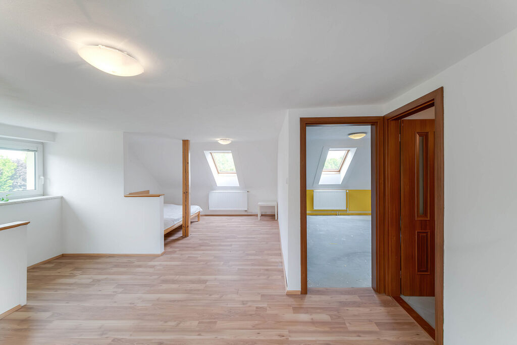 Hlavní obytný prostor domu se nachází v podkroví a tvoří jej obývací pokoj s jídelnou a kuchyní. Jeho charakter a kouzlo podtrhují dřevěné sloupy a výhled do zeleně. Dále na patře najdete příjemnou ložnici s praktickou šatnou a vlastním balkónem, samostatnou pracovnu a koupelnu se sprchovým koutem a WC. V přízemí hlavní části domu jsou dva pokoje a kuchyňský kout. Příjemné je propojení s exteriérem, přes balkonové dveře projdete na krytou terasu. Přízemí doplňuje garáž a prostorná technická místnost s dílnou, která nabízí velkorysý prostor pro kutily, posilovnu nebo jakékoli vaše budoucí využití.
