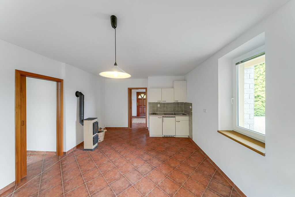 Ve vedlejší části (2+kk se samostatným vchodem) se v přízemí nachází prostorný pokoj s kuchyňským koutem, koupelna se sprchou a WC. Na patře je další samostatný pokoj a velká chodba, která je aktuálně využívána jako ložnice a pracovna. K dispozici je také další koupelna s vanou a WC.