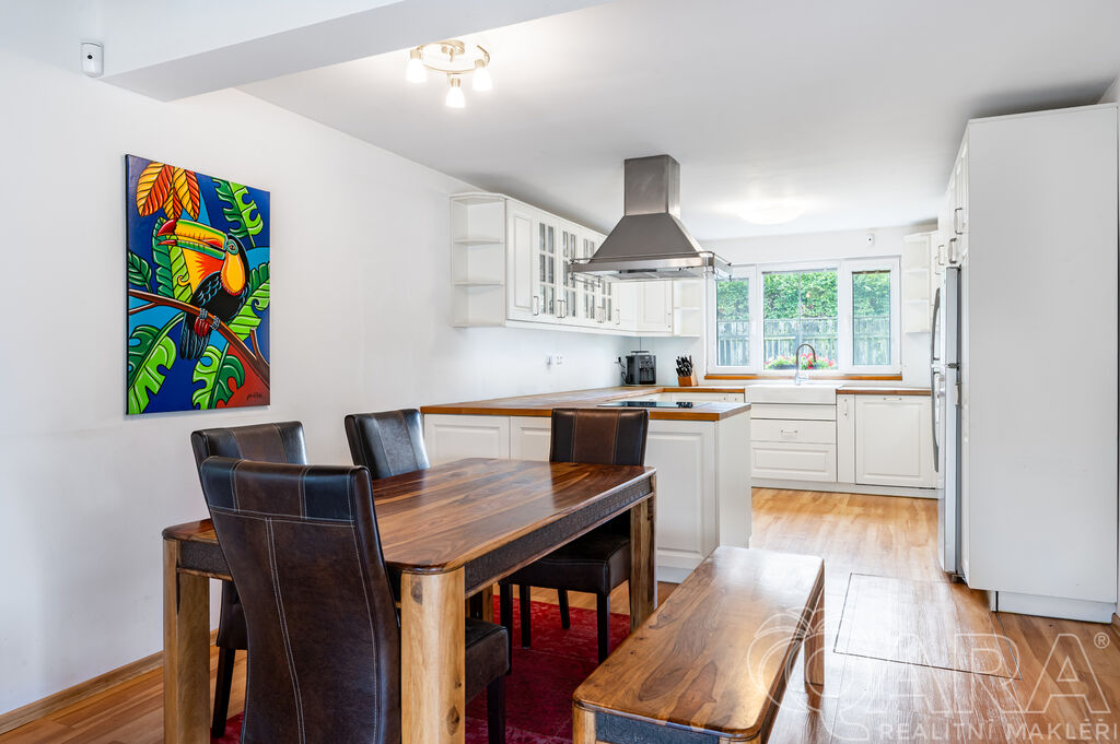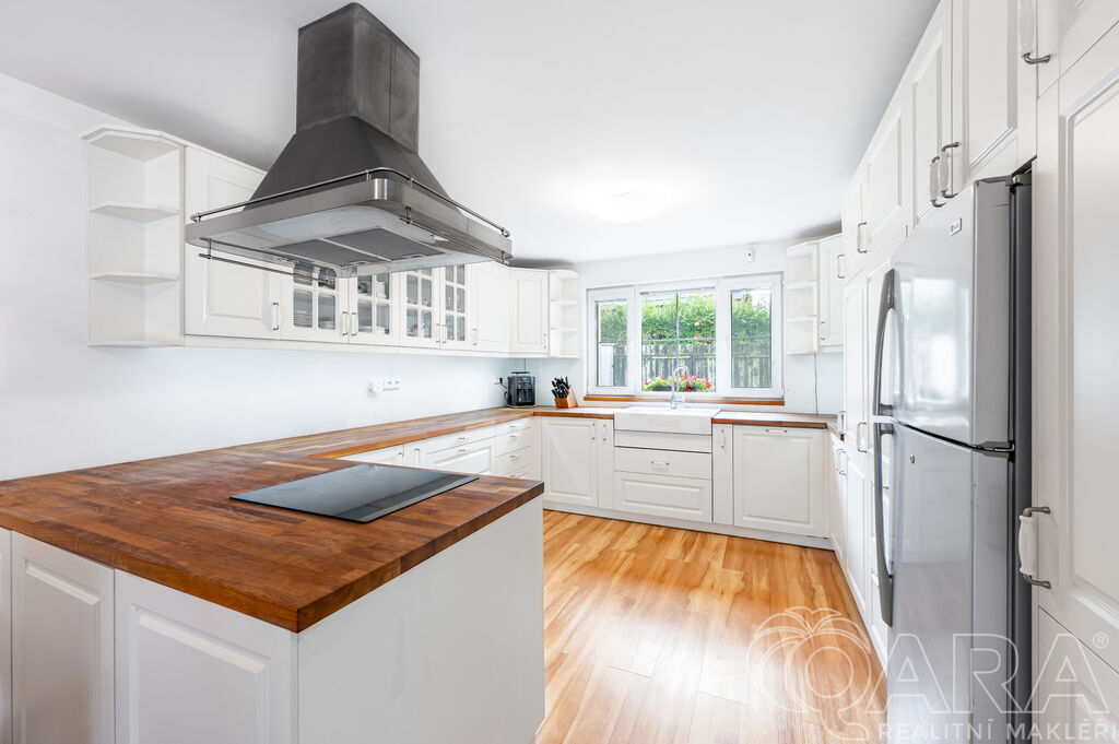 V přízemí najdete prostorný obývací pokoj se západní orientací, krbovými kamny a přímým vstupem do zahrady, velkorysou plně vybavenou kuchyni v přírodním designu a koupelnu s vanou, saunou a toaletou. Samozřejmostí je i technické zázemí.