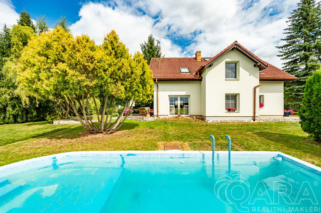 Prodej stylového nízkoenergetického rodinného domu se vzrostlou zahradou, bazénem, jezírkem a zahradním domkem v malebné obci Divišov – Radonice.