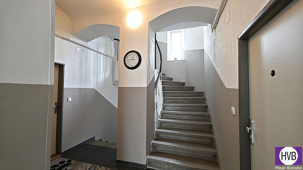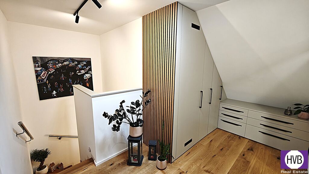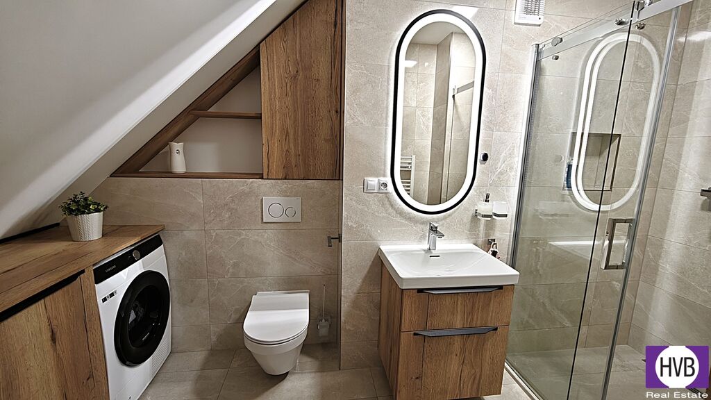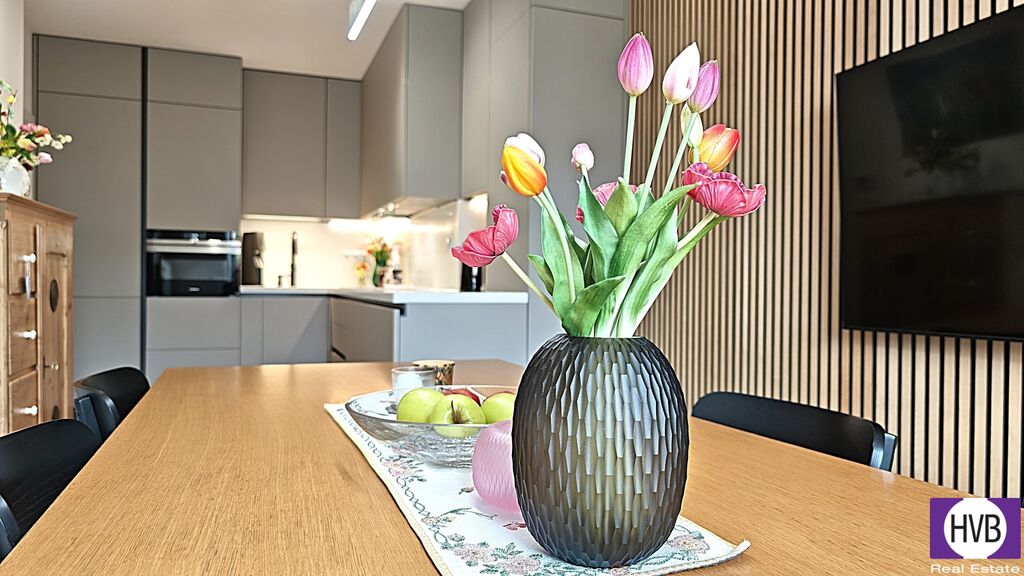 Bytová jednotka s klimatizovanými pokoji je zařízena nadstandardně, s důrazem na estetiku i funkčnost, nabízí se kompletně vybavená. Na její spodní úrovni naleznete prostorný obývací pokoj, jídelnu s moderně zařízeným kuchyňským koutem a balkonem, koupelnu s vanou a praktickou komoru, horní nabízí další dva pokoje a koupelnu se sprchovým koutem. Obě patra jsou elegantně propojena designovým schodištěm, vytápění řešeno vlastním kotlem.