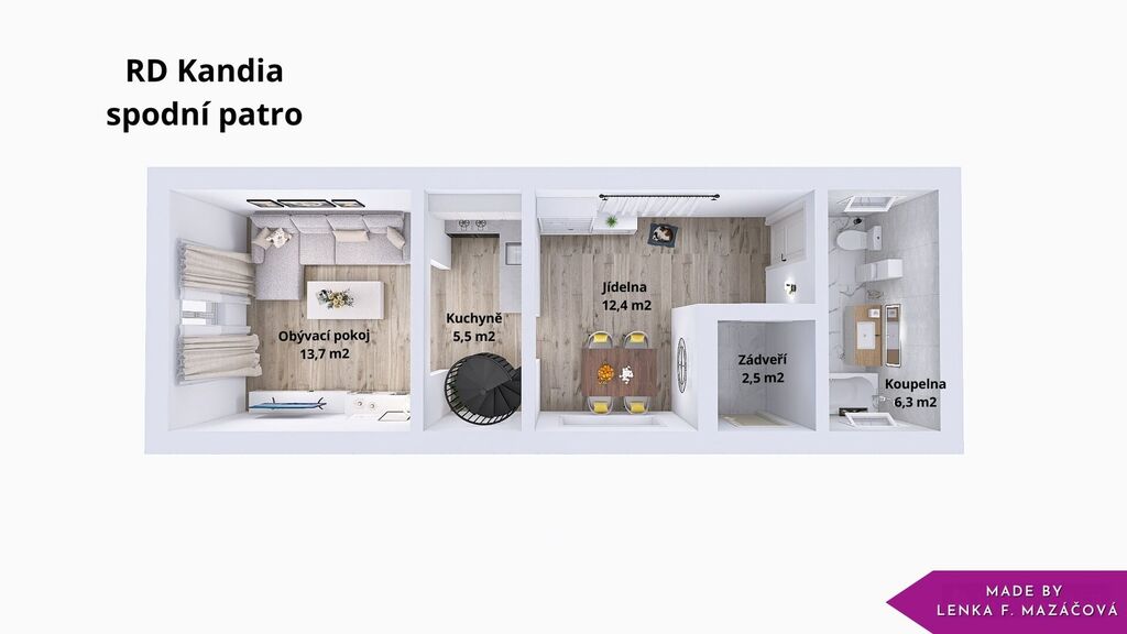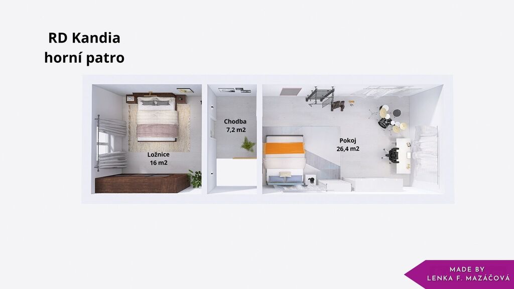 Spodní patro: 2+kk (jídelna, kuchyně, obývací pokoj, koupelna, předsíň). Horní patro má dva samostatné pokoje.