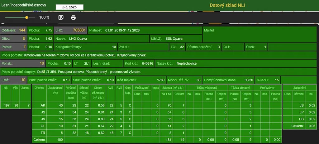 Jedná se o p.č. 994 vedená jako lesní pozemek o celkové výměře 232 m2 a p.č. 1525 vedená jako lesní pozemek o celkové výměře 989 m2. Stáří lesa a LHO viz. foto.