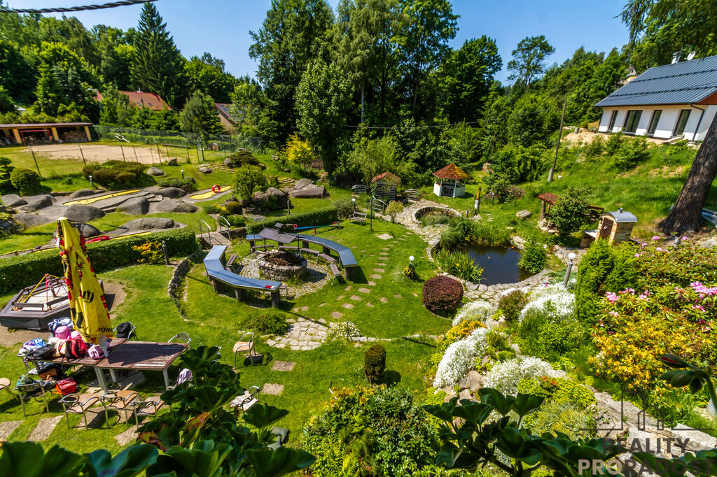 Exteriér penzionu tvoří multifunkční pozemek se zahradou o celkové rozloze 5204 m2, kde nalezneme vzrostlou zeleň, okrasné keře a kytičky, altán pro Relax, ohniště s grilem a posezením, dvě jezírka, dětský kolotoč, skluzavku, minigolf, multifunkční hřiště: volejbal, kopaná, házená, basketbal. V horní části pozemku se nachází podsklepená dvougaráž a asfaltové parkoviště pro 15 osobních automobilů, nebo několik autobusů. Vjezd je přes bránu na dálkové ovládání.