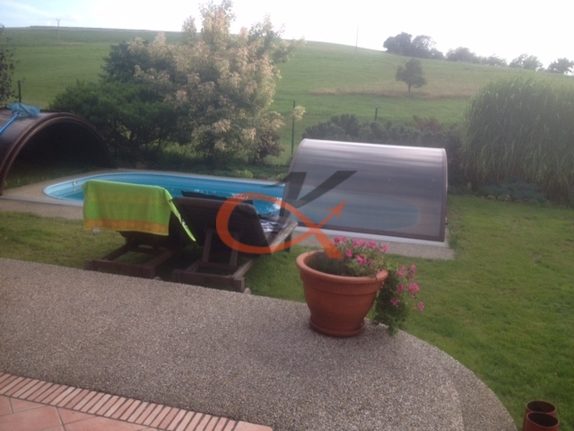 Pronájem nadstandardního domu 6+1 v obci Krhová. Jedná se o dům o zastavěné ploše 200m2, na který navazuje kryté stání, garáž pro tři auta, dílna. Pozemek kolem domu o výměře 1500m2, na pozemku jsou vzrostlé okrasné křoviny a bazén. Pozemek je oplocen, vjezd na pozemek z obecní komunikace celoročně udržované. Celková užitná plocha domu je 300m2. V přízemí domu se nachází vstupní chodba, technická místnost, koupelna s vanou, sprchovým koutem a WC, ložnice s šatnou, obývací pokoj, jídelna s kuchyní, špajzka, toaleta s umyvadlem, centrální chodba se schodištěm do patra domu. V obývacím pokoji jsou instalovaná krbová kamna, výstup na venkovní krytou terasu o výměře 35m2. Ve druhém podlaží jsou čtyři samostatné ložnice, z toho tři ložnice disponují šatnou, koupelna s toaletou, nejprostornější pokoj ve druhém podlaží má výměru 37m2. Dům je vytápěn plynovým kotlem, napojení na obecní vodovodní řád a kanalizaci. V případě zájmu je možnost po dohodě využívat přiléhající pozemek o rozloze 4500m2. Dům bude připraven k nastěhování v měsíci listopadu.