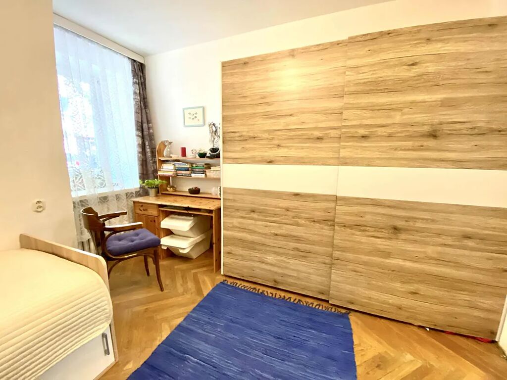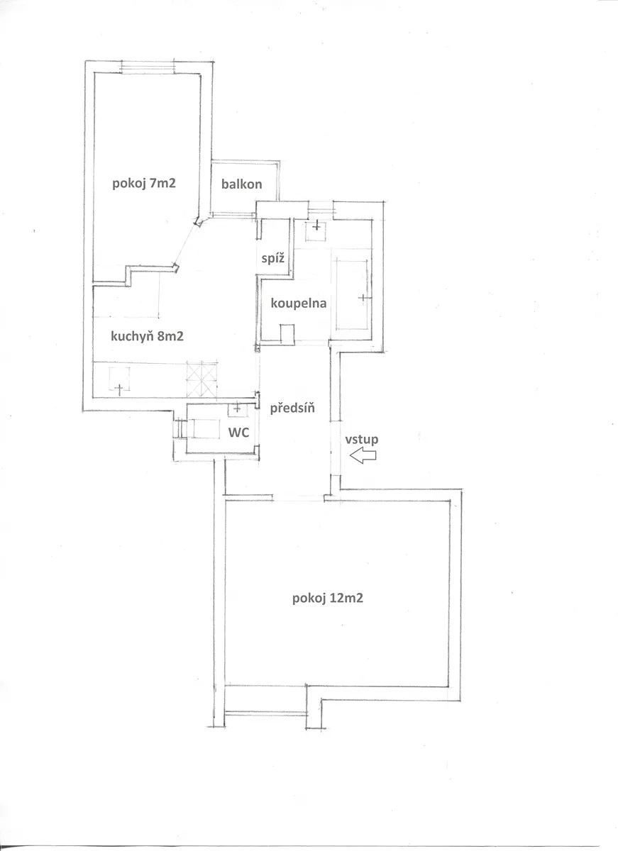 Dispozice: předsíň 4 m2, pokoj 13 m2 orientovaný do ulice, kuchyň 8 m2, spíž 0,5 m2, balkon do dvora z kuchyně, pokoj 7 m2 orientovaný do dvora, koupelna s vanou, WC samostatné s umývátkem a sprškou, suchý sklep 2 m2.