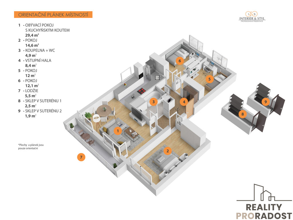 Celková plocha obytných místností činí 82 m2, plocha zasklené lodžie 6m2. K bytu dále náleží dvě sklepní kóje v podzemním podlaží domu o výměrách 2,5 m2 a 1,9m2.