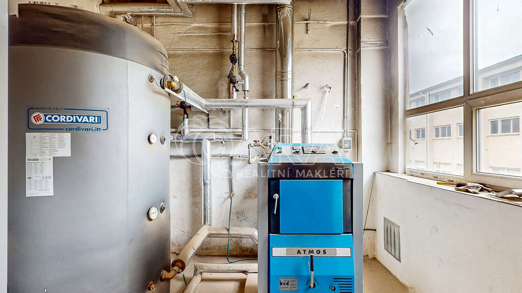- Zateplení stropů – foukaná izolace 25–30 cm, zakryté sádrokartonem (zbývá dokončit cca 1/3 haly), původní strop byl snížen o cca 1 m na současnou výšku 3,8 m.