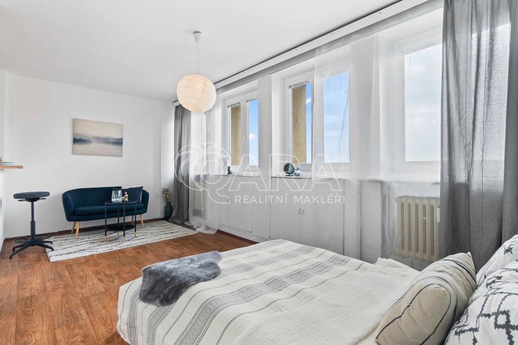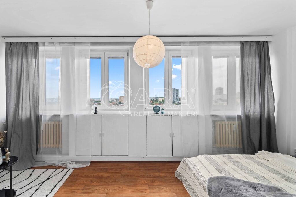Bytová jednotka se skládá z jednoho obytného pokoje, který působí překvapivě vzdušně. Dominují mu čtyři velká dvoukřídlá okna, která zajišťují nejen spoustu denního světla, ale i otevřený výhled směrem na Prahu. Díky západní orientaci si zde můžete užívat dechberoucí západy slunce. Kuchyňský kout je na byt této velikosti prostorný a nabízí možnost úpravy...buď zachovat barový pult, nebo vytvořit moderní linku s dostatkem místa pro stolování. Koupelna s vanou a toaletou je v původním stavu, ale díky své velikosti a dispozici poskytuje dobrý základ pro rekonstrukci.