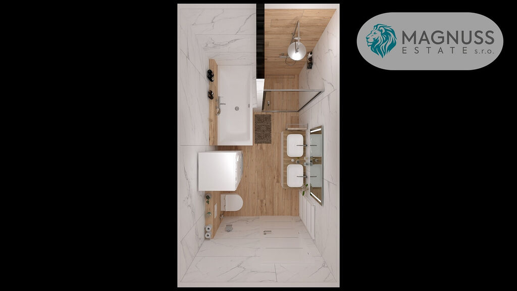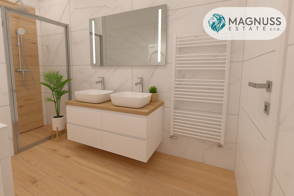 Moderní koupelny (Laufen, velkoformátová dlažba, vana i sprcha, 2× umyvadlo)