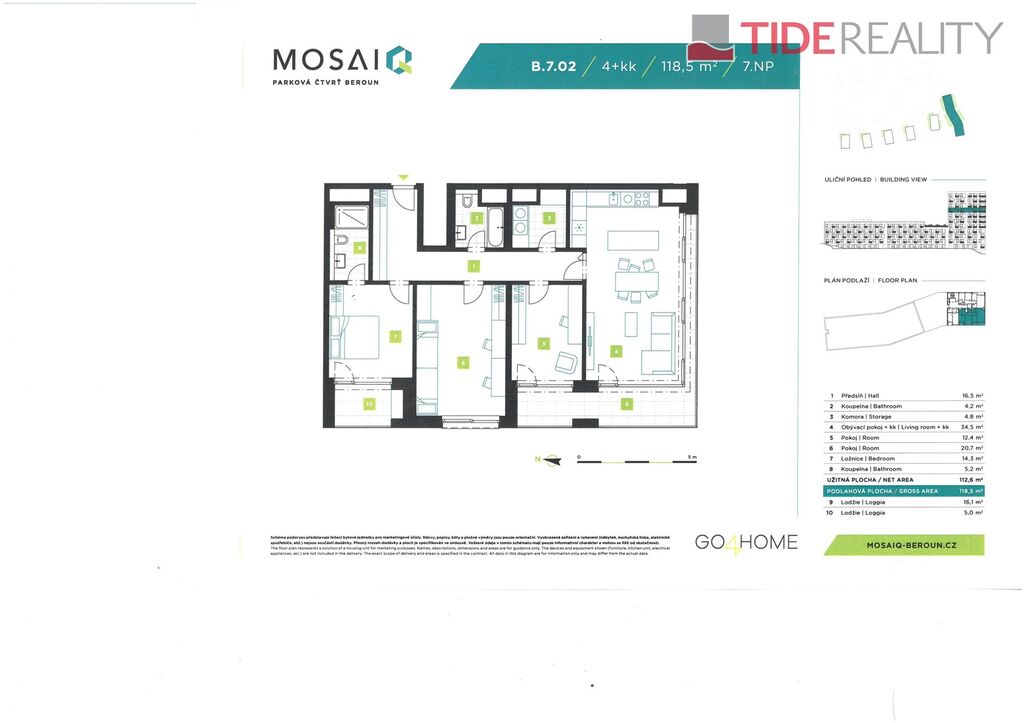 Tento konkrétní byt 4+kk o podlahové ploše 118,5m2 se dvěma lodžiemi 21m2 se nachází v 7.NP desetipodlažní budovy "B". Tento prostorný a velmi světlý byt ve vysokém patře bude nabízet krásné  jihozápadní výhledy z OP i ze všech tří ložnic i navazující prostorné lodžie. K dispozici budou dvě koupelny (vana i sprcha) a komora s prostorem i rozvody pro pračku i sušičku. K tomuto bytu jsou na výběr min. 2 parkovací stání venkovní/vnitřní a sklep (není zahrnuto v ceně). V celém projektu je velký výběr bytů 3,4,5+kk v rozmezí 88 až 120m2 i s prostornými terasami nebo se zahrádkami. Samozřejmě můžete vybírat i mezi byty 1,2+kk.