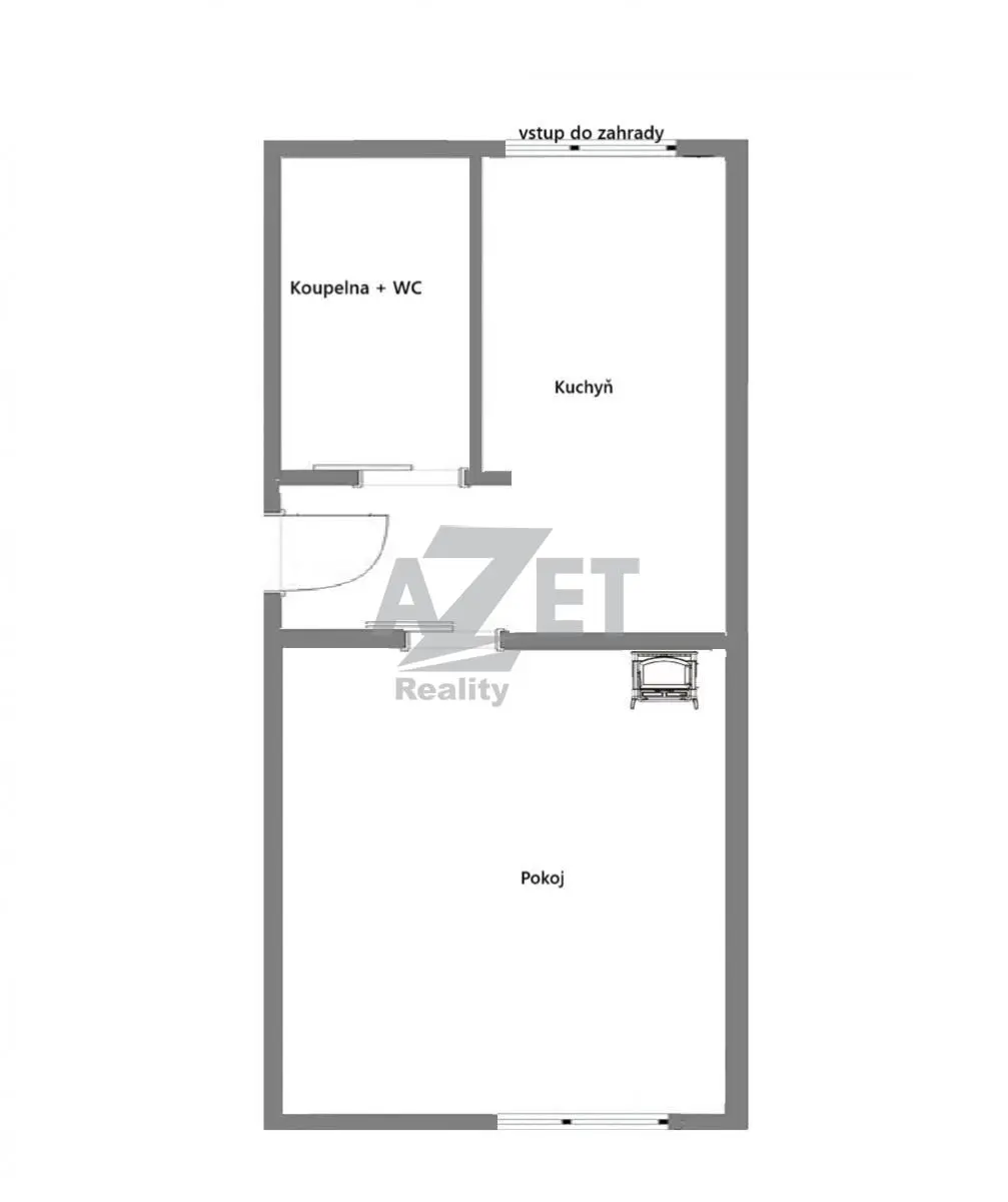 Byt 1+1, pokoj, kuchyň s vchodem na zahradu, koupelna s WC, zádveří.
