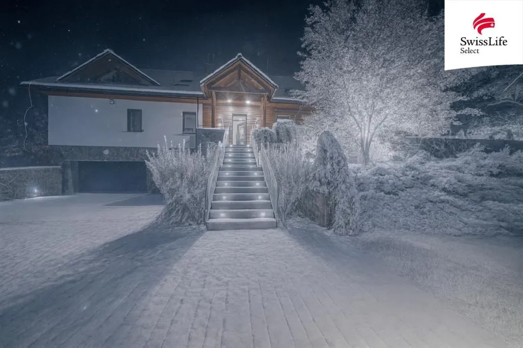 V podkroví rodinného domu se nachází prostorná pracovna, koupelna s wc a relaxační pokoj s finskou saunou. V podkroví lze využít i další prostory, které nyní nejsou dokončené. Majitelé nemovitosti zajímavým způsobem využili vzrostlého javoru na jižní straně domu. Kruhová terasa o ploše 80 m2, která vznikla kolem kmene stromu, nabízí krásný pohled na celou jižní část pozemku a přímo vybízí k relaxaci, odpočinku nebo k posezení s přáteli po náročném pracovním týdnu. Pod pergolou na východní straně domu je k dispozici venkovní kuchyň s posezením. Veškeré obložení exteriéru domu a zídek je z přírodního kamene, na celou stavbu, exteriér i interiér byly použity nadstandartní materiály včetně osvětlovací techniky.