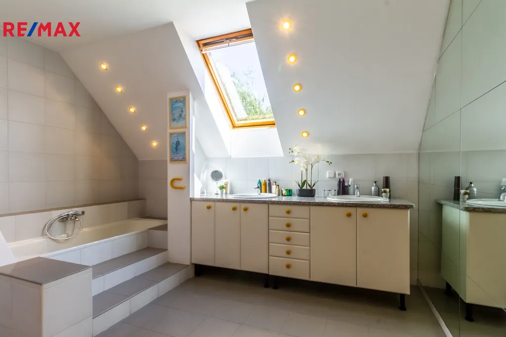 prostorná koupelna s vanou, dvouumyvadlem a WC