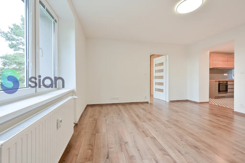 Byt byl po určitou dobu pronajímán, nyní je připraven k okamžitému nastěhování, i když si žádá několik drobných oprav. Dispozičně nabízí vedle kuchyně menší neprůchozí pokoj vhodný jako dětský pokoj nebo pracovna a prostorný obývací pokoj, který je průchozí do ložnice s výhledem do zeleně. Součástí bytu jsou také vestavěné skříně. Celkově působí interiér velmi světlým dojmem, a to i díky oknům orientovaným na dvě světové strany.