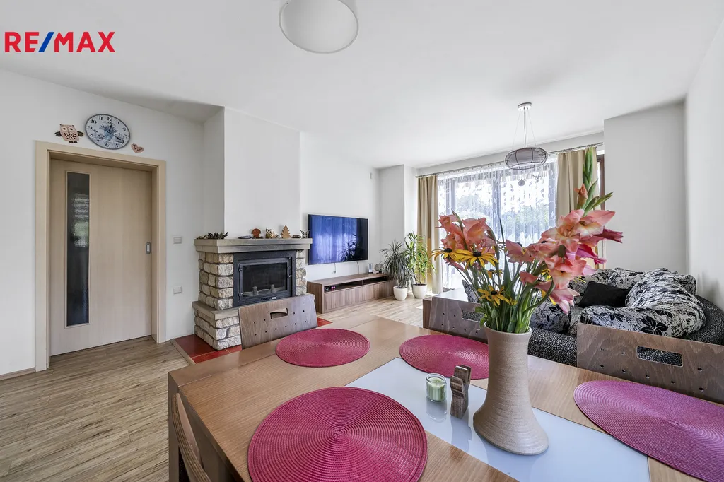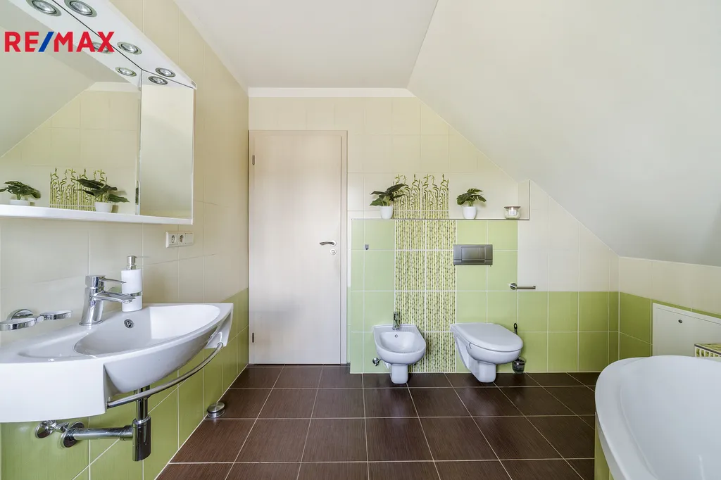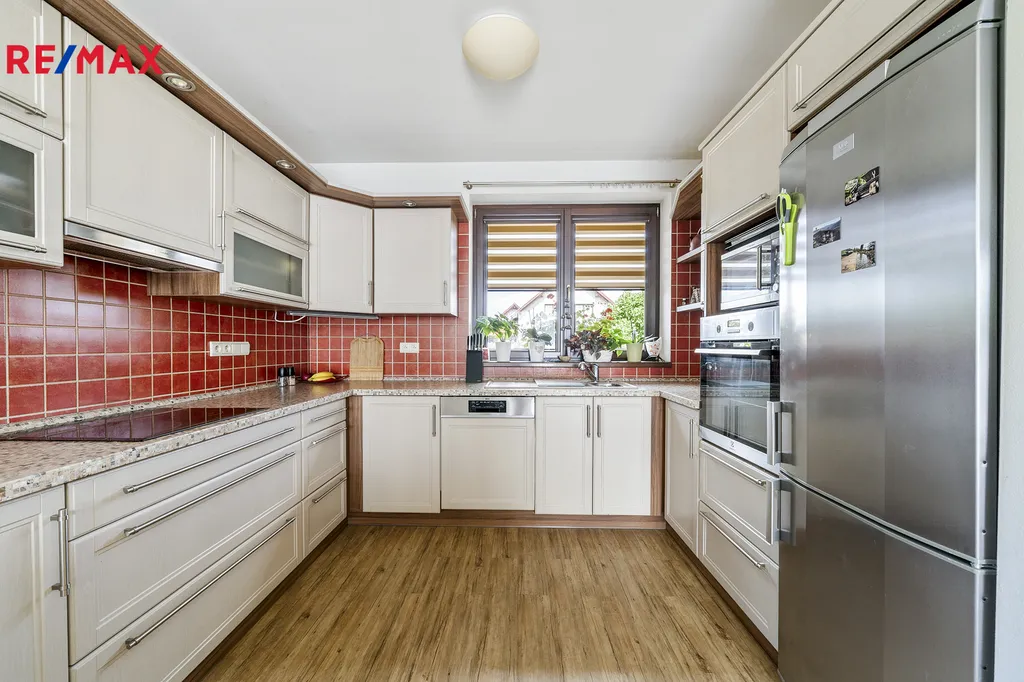 Ve výhradní zastoupení společnosti RE/MAX Future nabízíme k prodeji zděný rodinný dům o dispozici 5+kk se skladem, krytým parkovacím stáním a dalším příslušenstvím, který se nachází na pravidelném pozemku o celkové výměře 1057 m2. Typový rodinný dům od renomované architektonické kanceláře byl postaven v roce 2010 a jeho obvodové zdivo je tvořeno cihlou Porotherm a navíc zatepleno. Do detailů promyšlená dispozice stavby poskytuje v přízemí obývací prostor s kuchyňským a jídelním koutem a prostorný samostatný pokoj, obě dvě místnosti mají přístup francouzskými okny na zahradu s terasou orientovanou jižním směrem. V podkroví se nacházejí další tři plnohodnotné pokoje. V obou podlažích kromě komunikačních prostor jsou umístěny koupelny s toaletou, v přízemí se sprchovým koutem, v podkroví s rohovou vanou. Dispozici domu doplňuje sklad se samostatným vchodem ze zahrady a kryté parkovací stání přímo proti vjezdovým posuvným vratům na dálkové ovládání. Úložný prostor (spíž) také pod schody do podkroví, v koupelně v podkroví a pod hřebenem v půdním prostoru. Vytápění rodinného domu zajišťuje plynový kotel s podlahovým vytápěním a alternativně krbová vložka s teplovzdušným rozvodem do místností a tak společně s kvalitní konstrukcí pláště budovy bylo dosaženo vynikající energetické náročnosti třídy B. Moderní kuchyňská linka je vybavena vestavěnými spotřebiči, na podlahách ve všech místnostech vinyl, do podkroví vedou schody z masivu. Podkrovní místnosti prosvětleny okny do štítových zdí a částečně střešními okny, terasu zastiňuje stahovací markýza. V domě instalováno zabezpečovací zařízení.