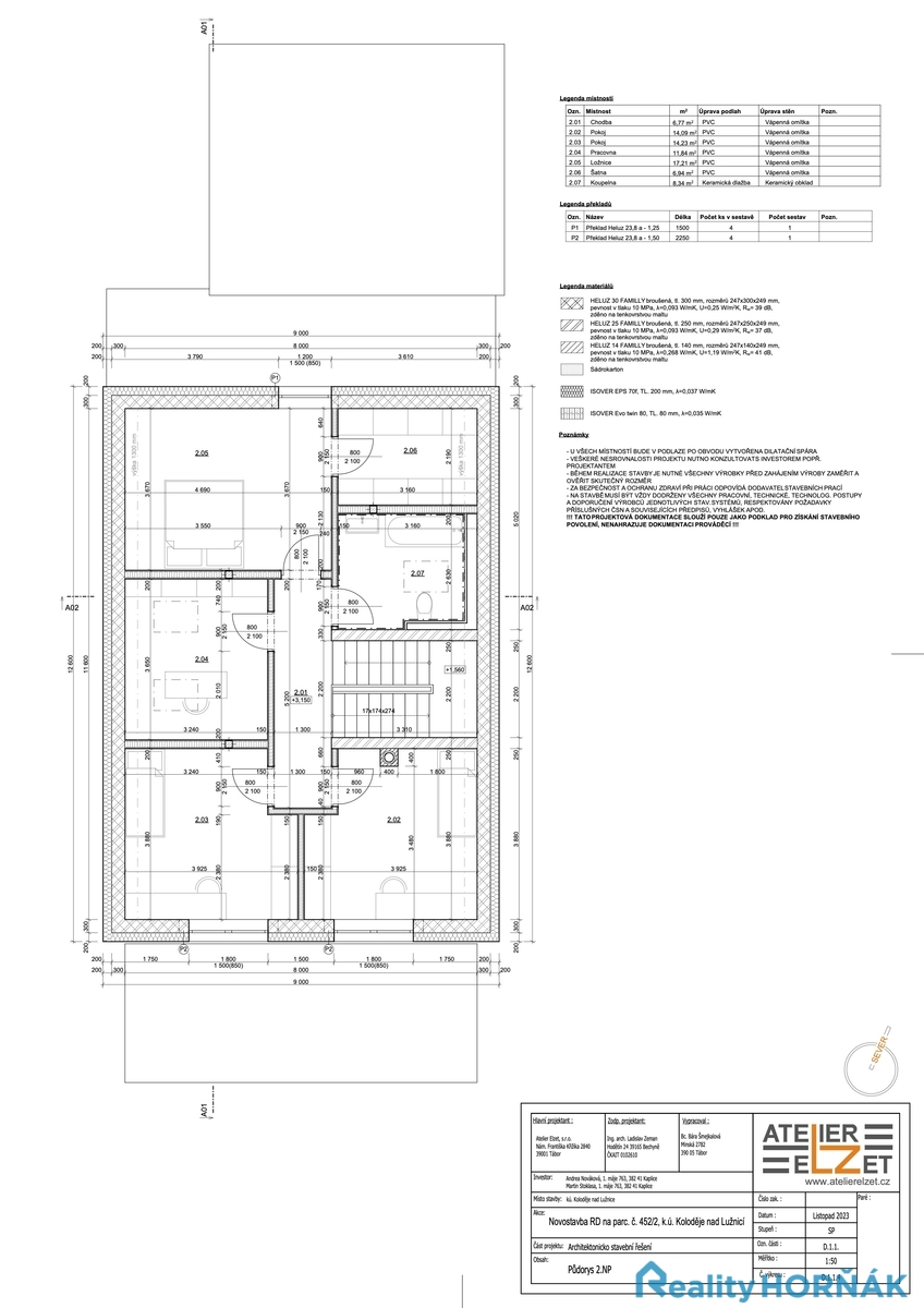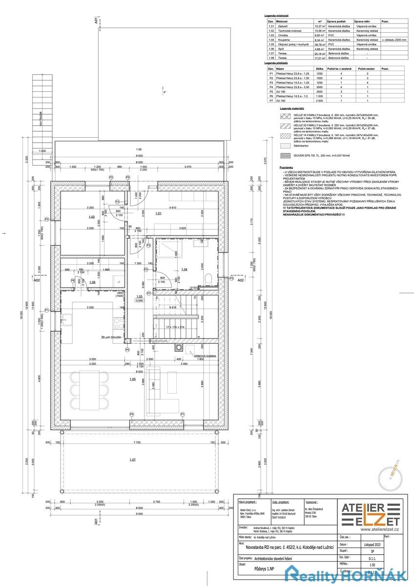 Součástí prodeje je kompletní projektová dokumentace a pravomocné stavební povolení ke stavbě novostavby rodinného domu, přístřešku pro auto a terasy s bioklimatickou pergolou. Stavebně se jedná o dvoupodlažní rodinný dům s jednou bytovou jednotkou o dispozici 5+1 se dvěma sociálními zázemími a technickou místností. Zastavěná plocha RD je 133 m2.