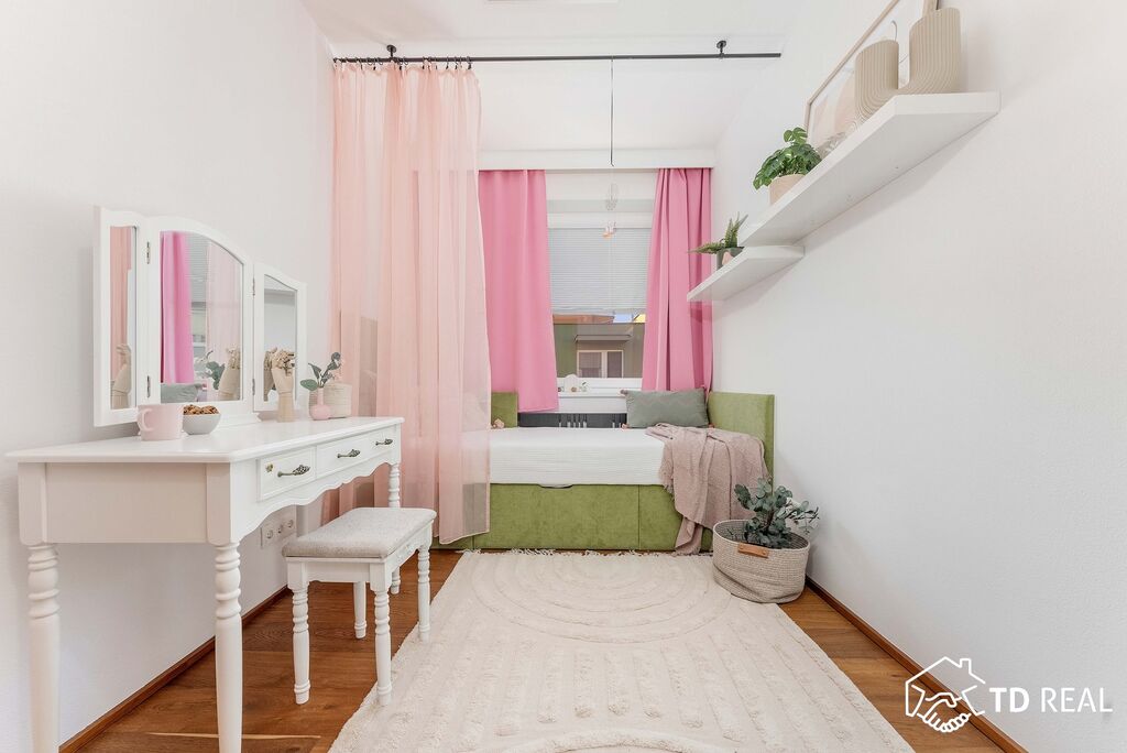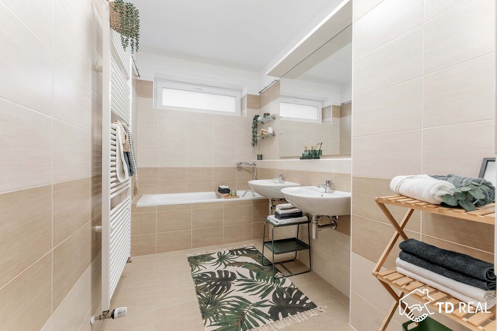 V interiéru se dbalo na kvalitu – podlahy jsou masivní dubové, což dodává bytu nadčasový vzhled i příjemnou atmosféru.