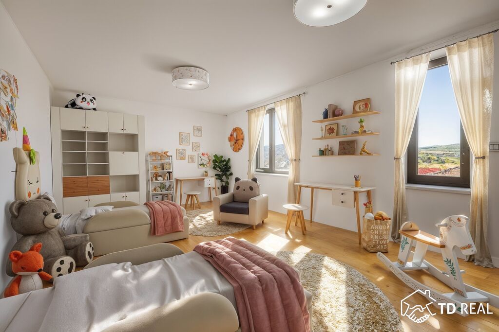 V patře jsou dvě světlé ložnice, druhá koupelna a další šatna, což zajišťuje dostatek úložného prostoru pro celou rodinu.