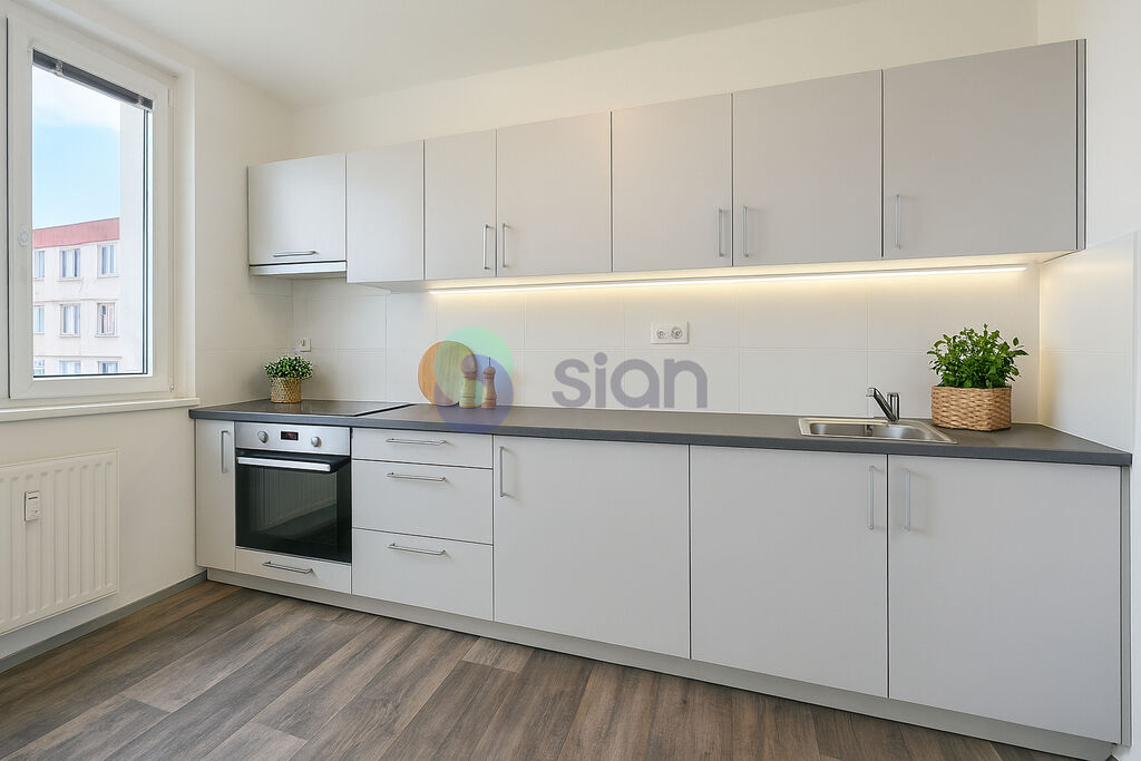 Byt je po kompletní rekonstrukci, která proběhla v roce 2022. Původní umakartové jádro bylo sneseno a nově vyzděno (tvárnice Ytong). V kuchyni je nová linka na míru s vestavěnou varnou deskou, elektrickou troubou a dřezem. Koupelna disponuje vanou, přípojkou na pračku, umyvadlem se skříňkou a toaletou. V bytě jsou nové omítky, podlahy (PVC) a nové rozvody včetně elektřiny v mědi. Byt je momentálně prázdný, uklizený a připravený k nastěhování.