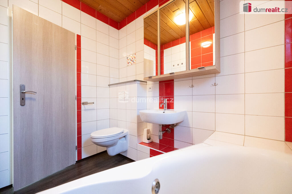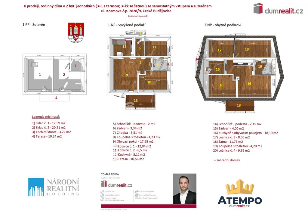 Dumrealit.cz Vám zprostředkuje prodej dokončeného rodinného domu o 2 bytových jednotkách (3+1 s terasou; 3+kk se šatnou a možností propojení v jeden rodinný dům) se samostatnými vchody, parkovacími místy před domem, společnou oplocenou zahradou a skladovacími prostory v suterénu domu s možnosti přestavby na 3 bytovou jednotku s bezbariérovým přístupem v klidné části městské čtvrti Suché Vrbné ve městě České Budějovice, ul. Kosmova 2828/9. Zděný RD byl zkolaudován v roce 2017 a do dnešního dne je pronajat dlouhodobým nájemníkům (nájemné celkem 26.000,-Kč + energie/měsíc). Vytápění je řešeno elektrickými přímotopy, v bytě v 1.NP je možné topit kamny na tuhá paliva. Ohřev teplé vody je za pomoci elektrického bojleru. Objekt je připojen na elektrickou síť, veřejný vodovod a městskou kanalizaci. Bytové jednotky mají podružné měření energií (el., voda). Doporučuji prohlídku, nemovitost je vhodná k investici nebo ke klidnému rodinnému bydlení. Více informací Vám poskytne realitní makléř Tomáš Pelda z realitní kanceláře A TEMPO fungující pod ochrannou známkou dumrealit.cz. Zajistíme Vám financování a veškerý právní servis. Ev. číslo: 652429.
